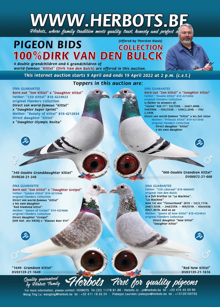 世界著名的“基特尔”(迪克·范登布克 - Dirk Van den Bulck)的4 羽双重孙代和 6 羽孙代在本次拍卖中提供。 所有拍卖鸽均由著名的德国冠军托尔斯滕·布兰克(Thorsten Blank)作出。