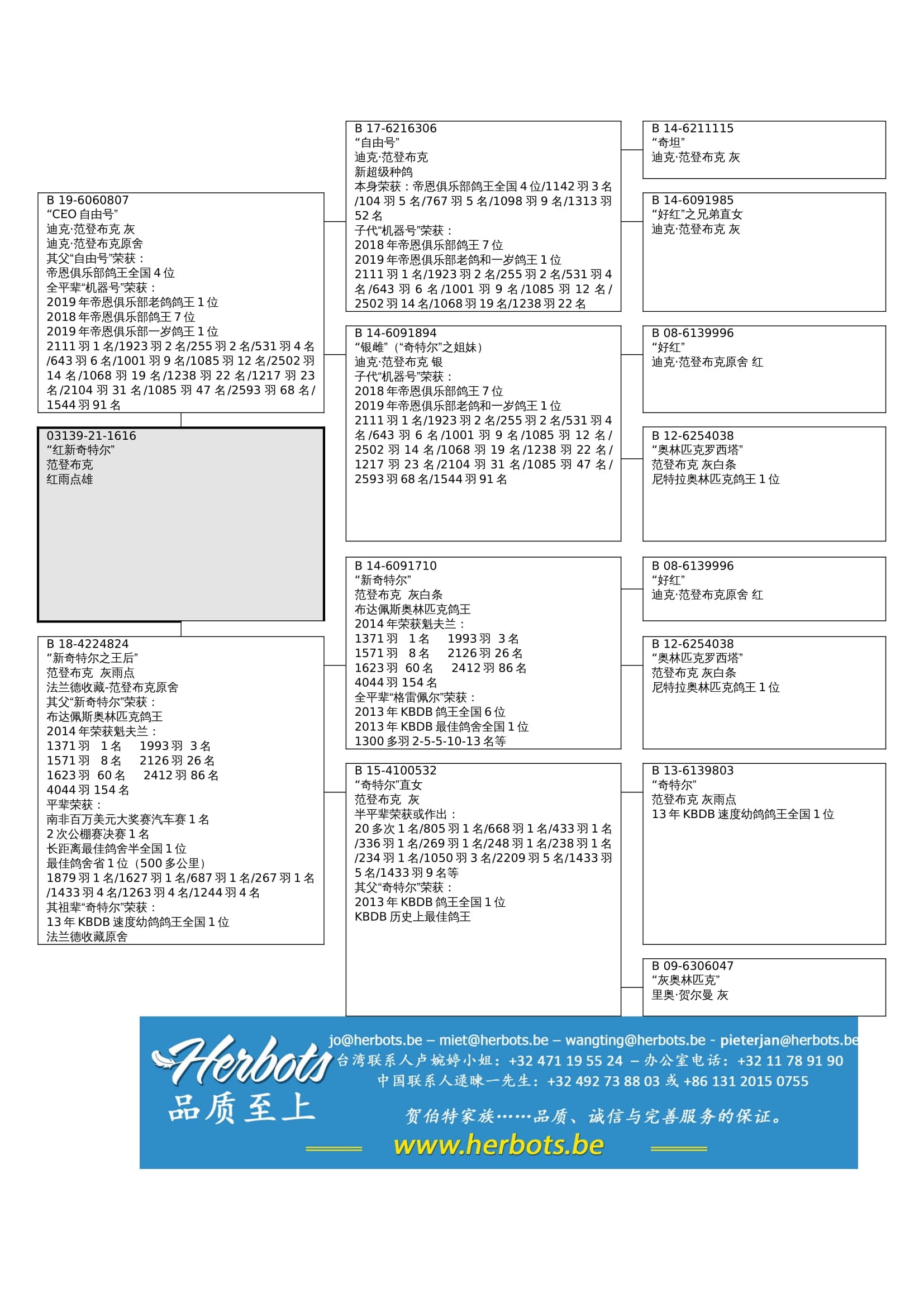 全平辈代表: “奇特尔” (KBDB 速度鸽王全国1位) , “格雷佩尔” (KBDB鸽王全国6位), “白羽奇特尔 702” (作出KBDB鸽王全国3位), “安吉莉娜” (作出