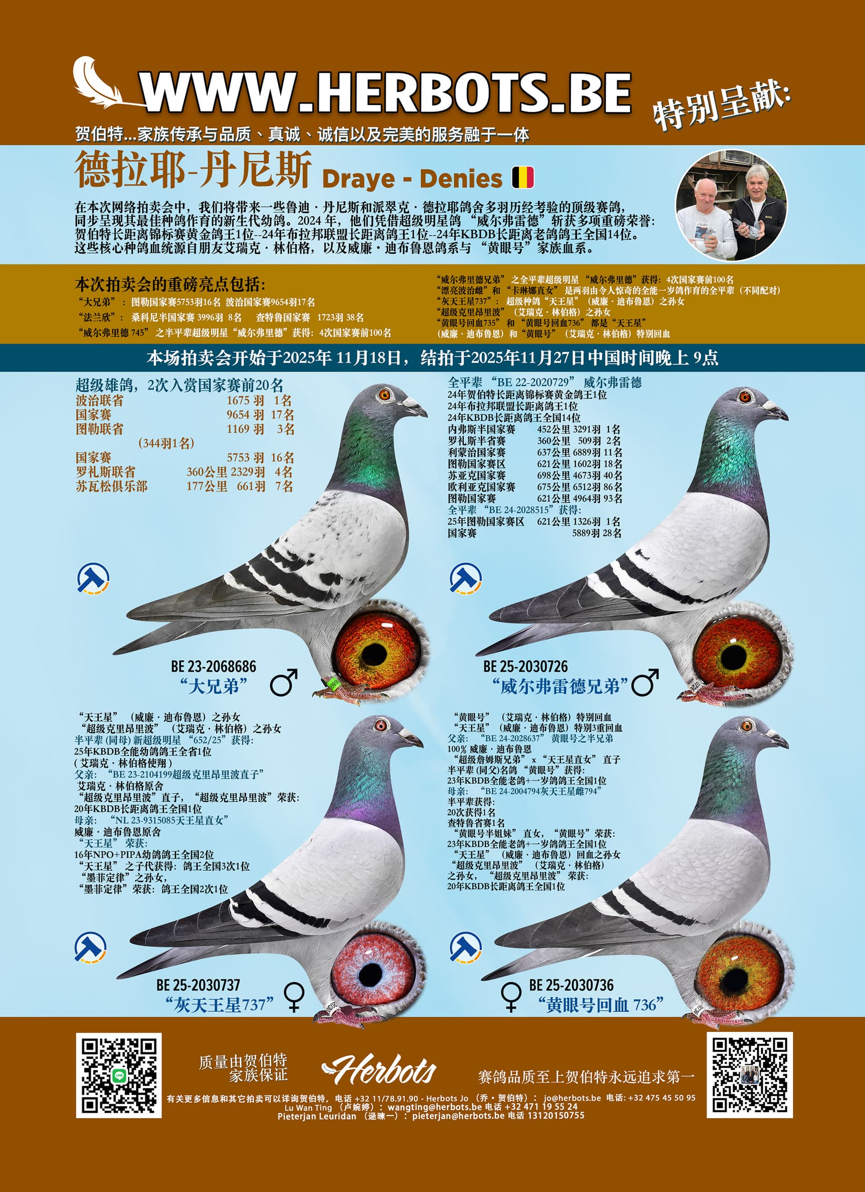 在本次网络拍卖会中,我们将带来一些鲁迪·丹尼斯和派翠克·德拉耶鸽舍多羽历经考验的顶级赛鸽,同步呈现其最佳种鸽作育的新生代幼鸽。2024 年,他们凭借超级明星鸽 “威尔弗雷德”斩获多项重磅荣誉:贺伯特长距离锦标赛黄金鸽王1位--24年布拉邦联盟长距离鸽王1位--24年KBDB长距离老鸽鸽王全国14位。这些核心种鸽血统源自朋友艾瑞克·林伯格,以及威廉・迪布鲁恩鸽系与 “黄眼号”家族血系。