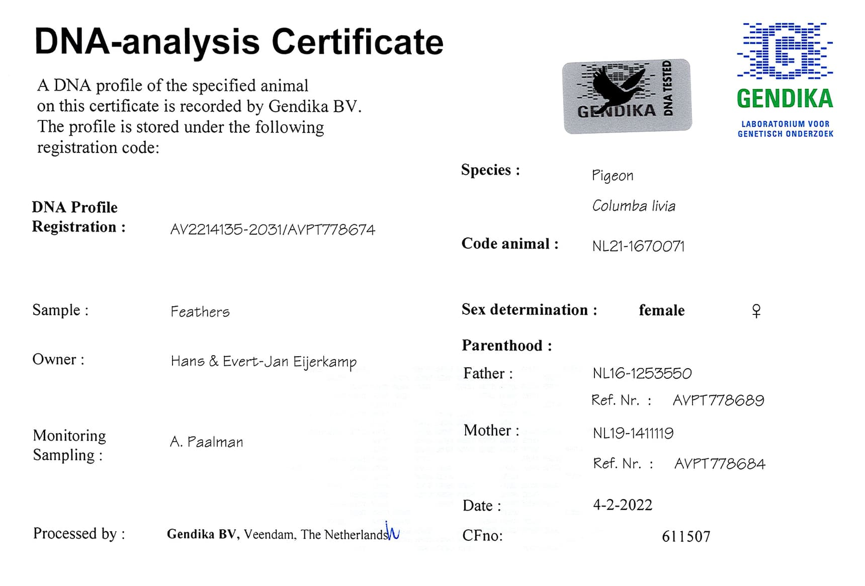 “奥林匹克 003”直子) x “卡度雌” (2 羽鸽王全国1位之祖母 – “新奥林匹克”直女) 直子