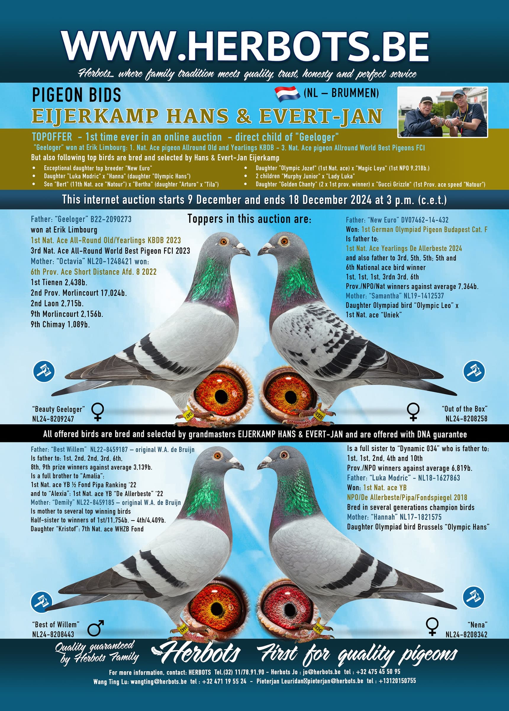 艾亚卡·普汉斯和埃弗特-杨(eijerkamp hans & evert-jan)- 包括“黄眼之女”(首次在线上拍卖会提供“黄眼”kbdb全能鸽王全国冠军的一羽子代)