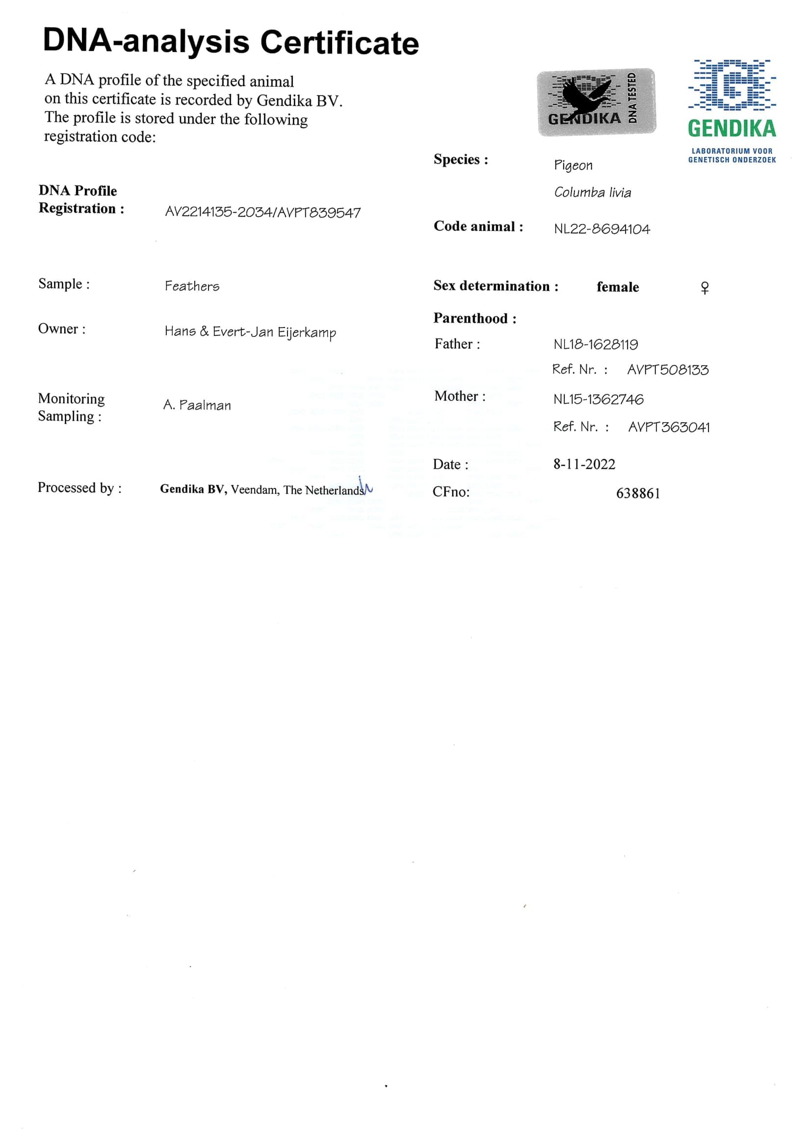 母亲:NL 15-1362746“白羽欧元”