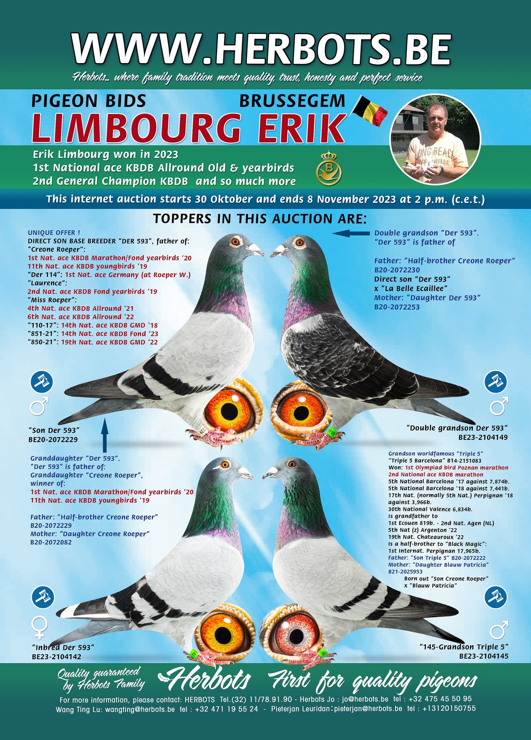 基础种鸽“593”直子,其子代代表及佳绩: