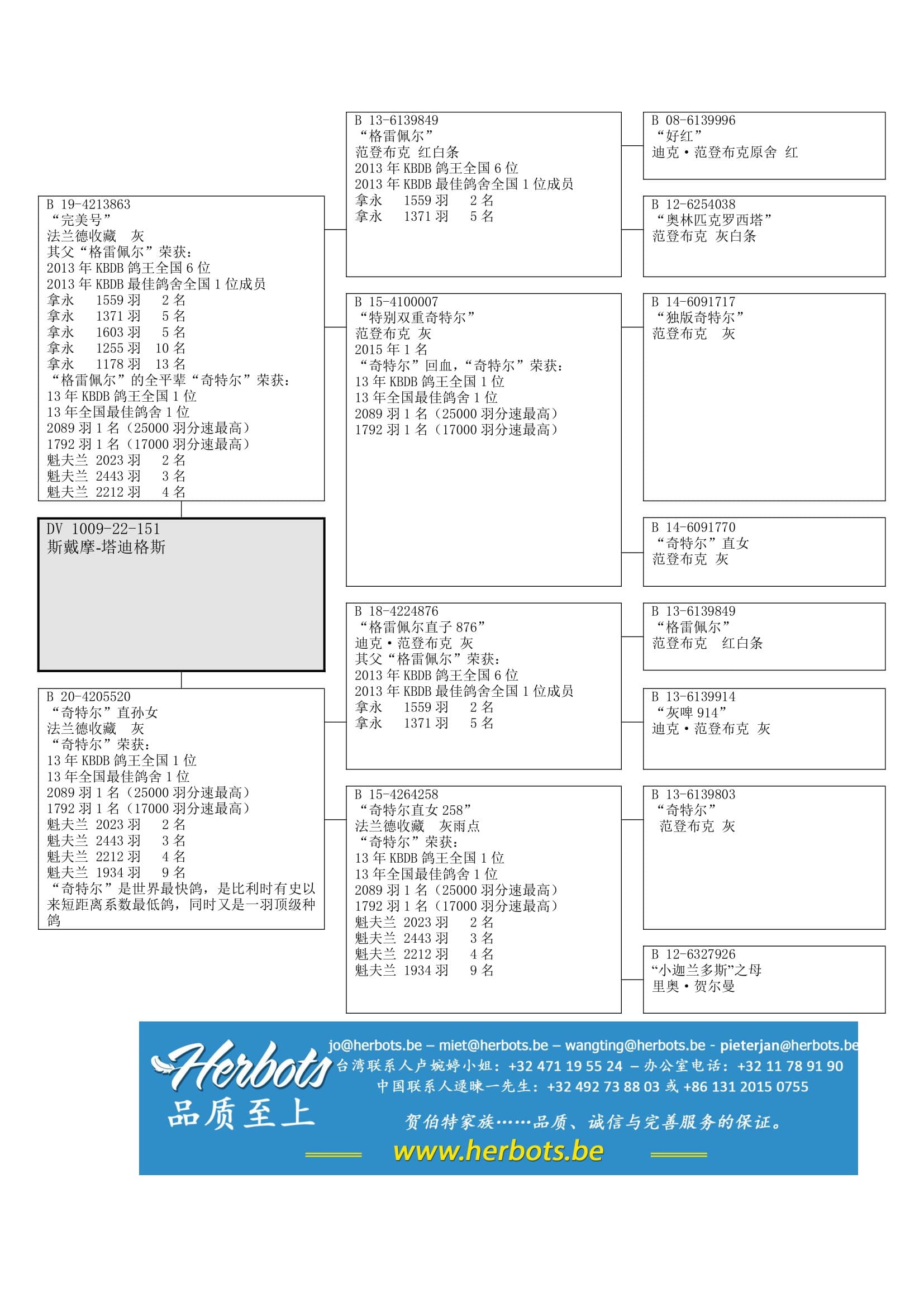 全平辈代表及佳绩: “奇特尔” (KBDB速度鸽王全国1位) , “新奇特尔” (奥林匹克鸽王6位), “白羽奇特尔 702” (作出KBDB鸽王全国3位), “安吉莉娜” (作出KBDB鸽王全国15位), “金粉” (作出NPO鸽王全国3位), “黄金奇特尔” (作出KBDB鸽王全国16位)