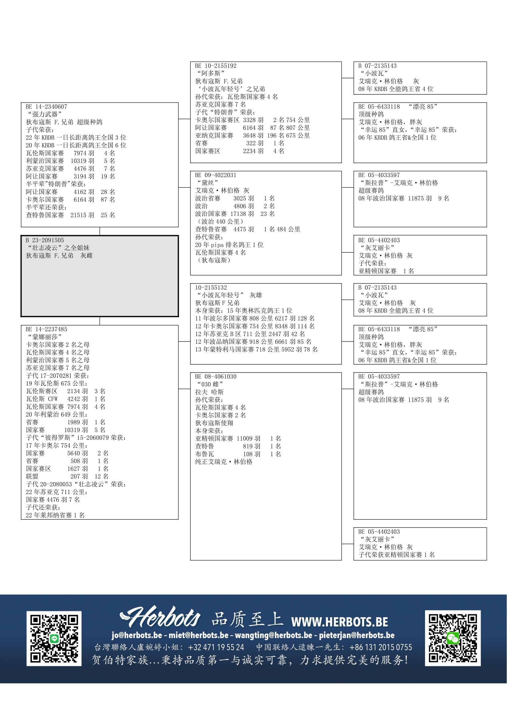 “阿多斯” (奥林匹克鸽王和鸽王全国3位“小波瓦年轻号”之全兄弟) x “黛丝” (荣获 查特鲁 4,775羽1名 – 波治 3,025羽1名 –波治 4,806羽2名 – 国家赛 17,138羽23名 – 等等)作出