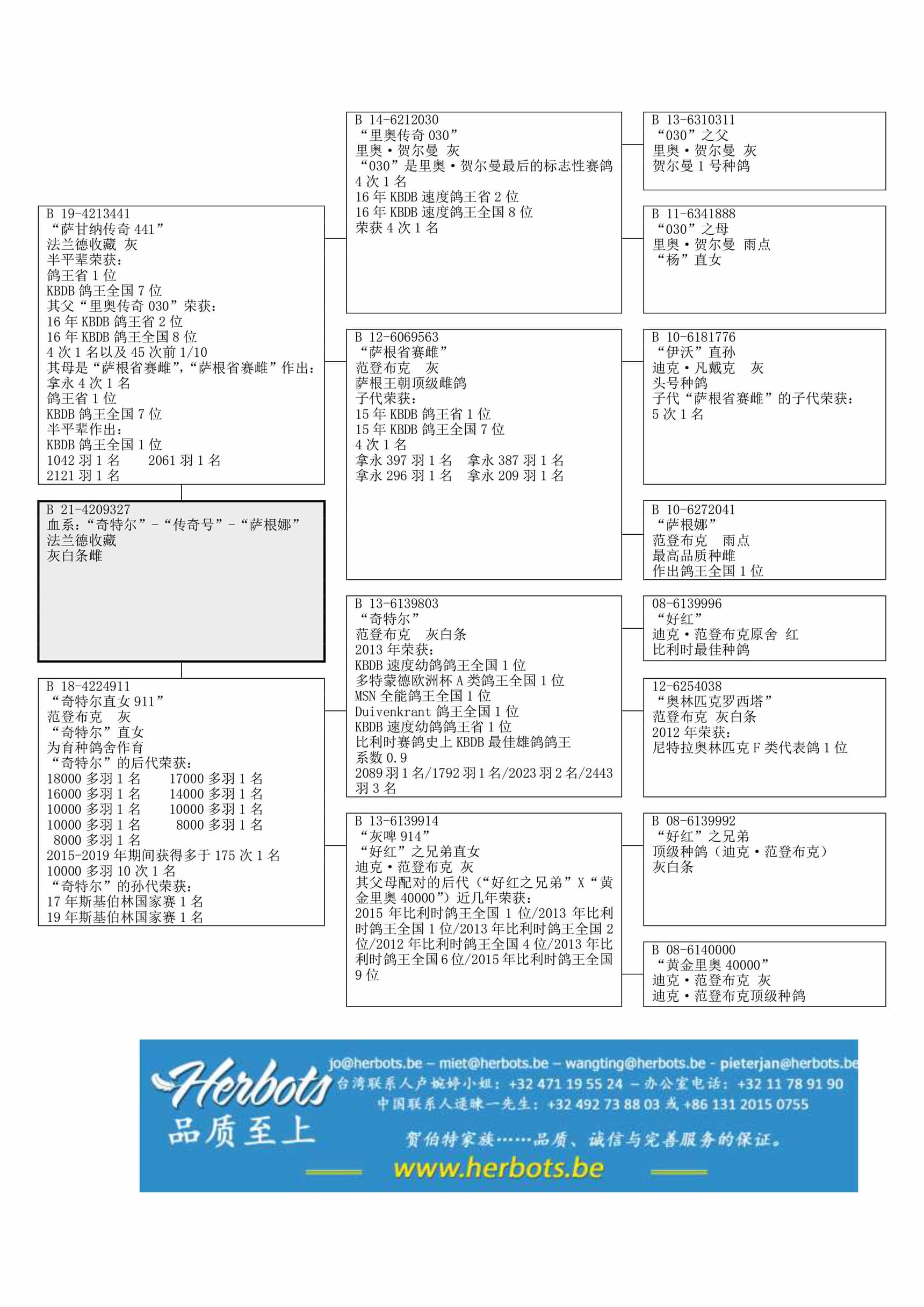“好红之兄弟” x “黄金里奥 40000”直女. 这一配对的后代荣获: 15年KBDB鸽王全国1位 – 13年KBDB鸽王全国1位 – 13年KBDB鸽王全国2位 – 12年KBDB鸽王全国4位 – 13年KBDB鸽王全国6位 – 15年KBDB鸽王全国9位