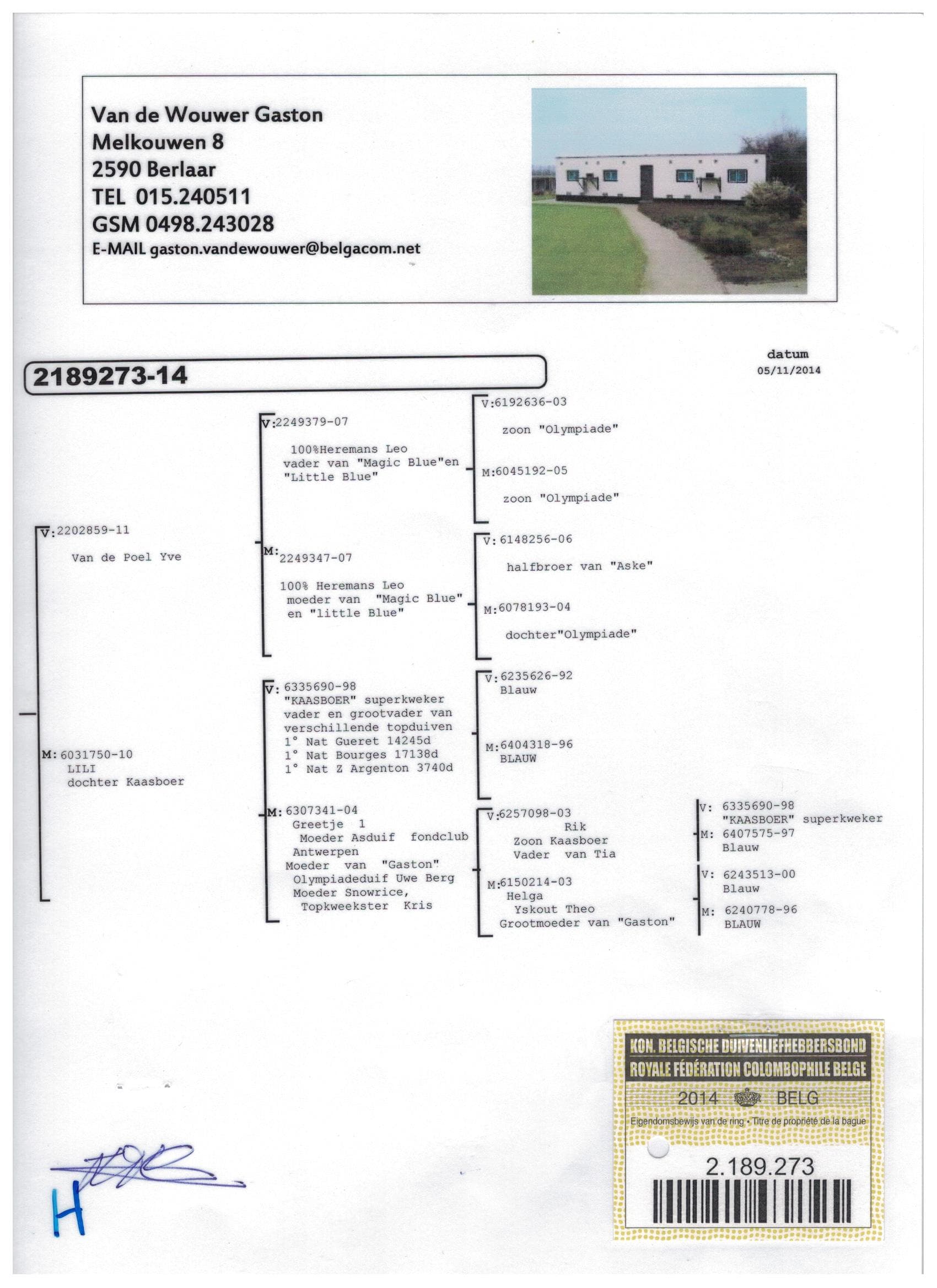100% 葛斯顿·范德瓦尔“纳菲” (荣获:亚精顿省赛4,017 羽1 名-亚精顿国家赛27,254 羽12 名) 直孙女血统中包含2 重“乳酪小子”