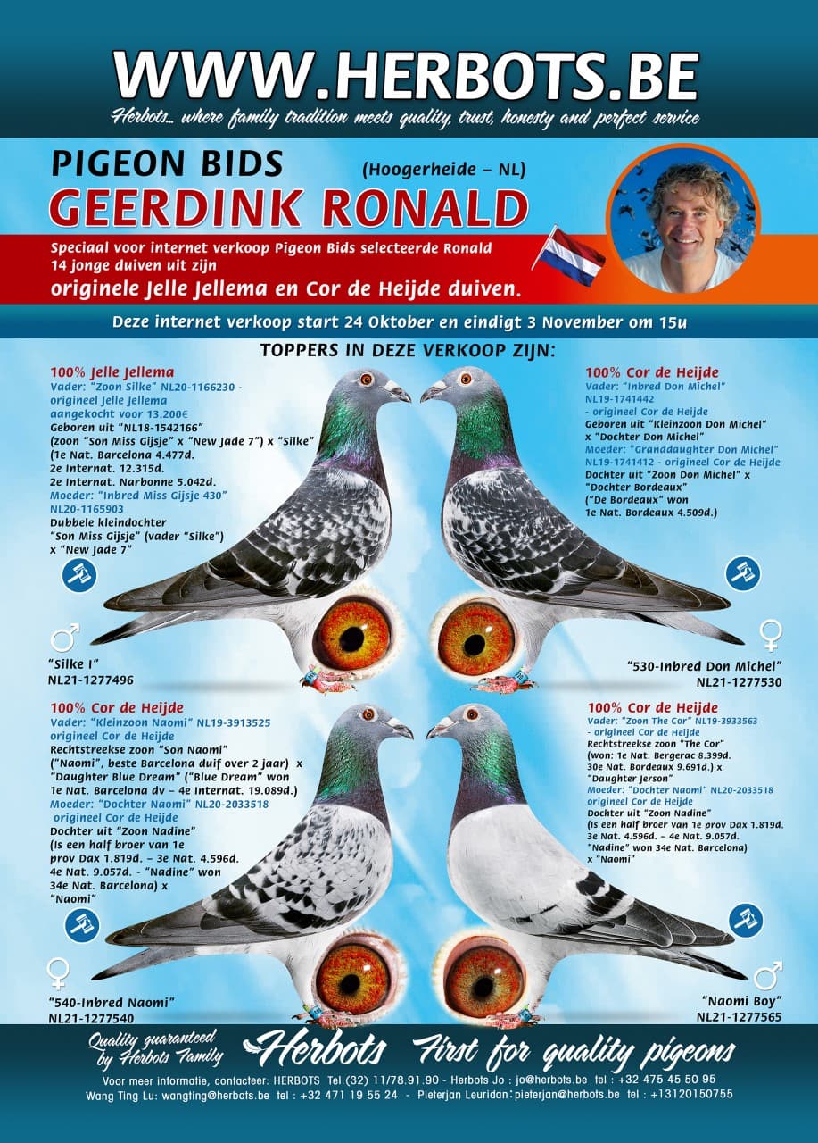 Now you have the opportunity to purchase young pigeons from the fantastic breeding loft of Ronald Geerdink. The loft that already produced 17 (Inter)national victories/ Ace pigeons.