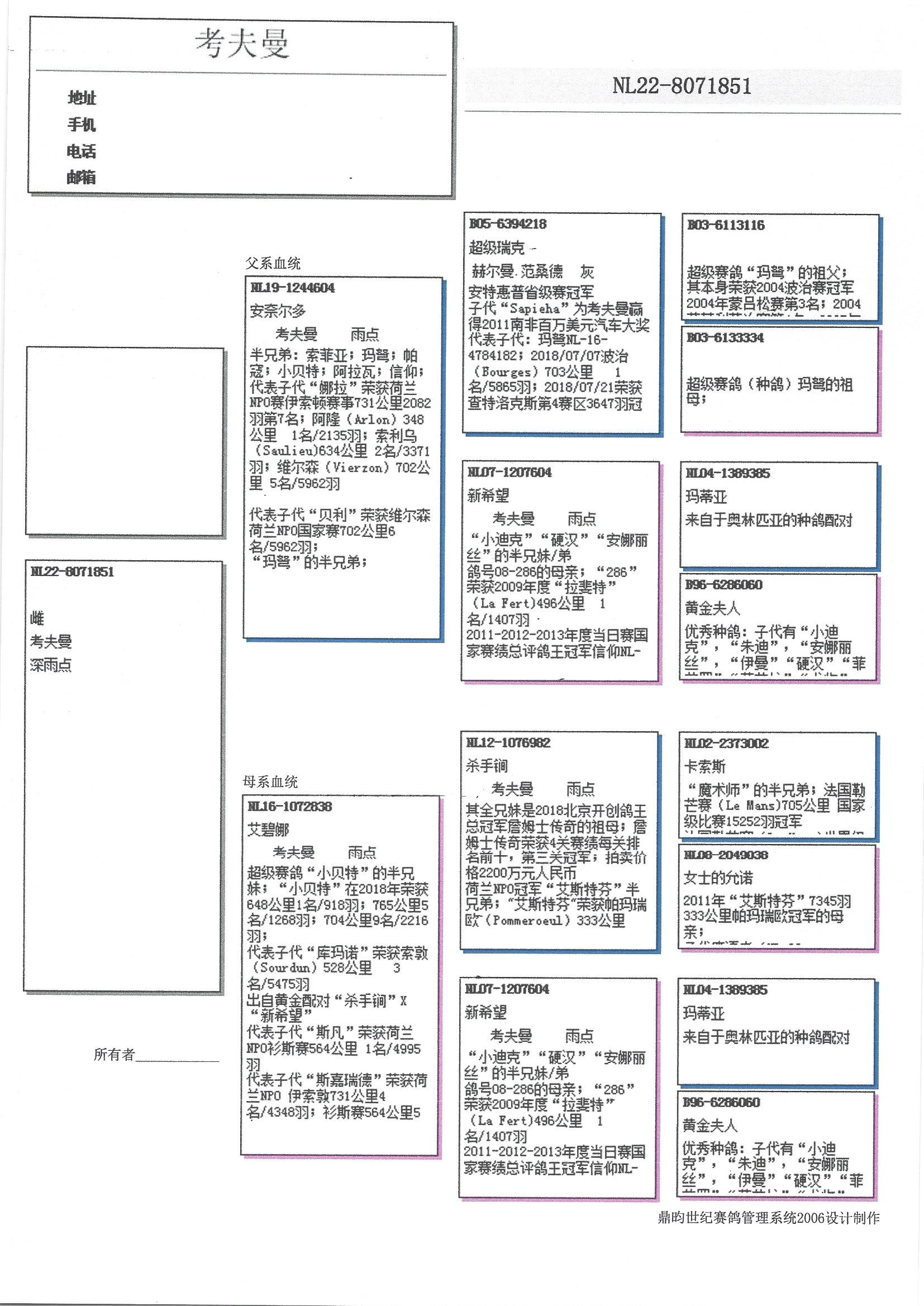 “信徒” (2011-2013年长距离之窗 E/F类鸽王全国1名) “法莎”: NPO 森斯 4,237羽1名 - “思凡” (森斯10-11区分速 10,701羽1名)