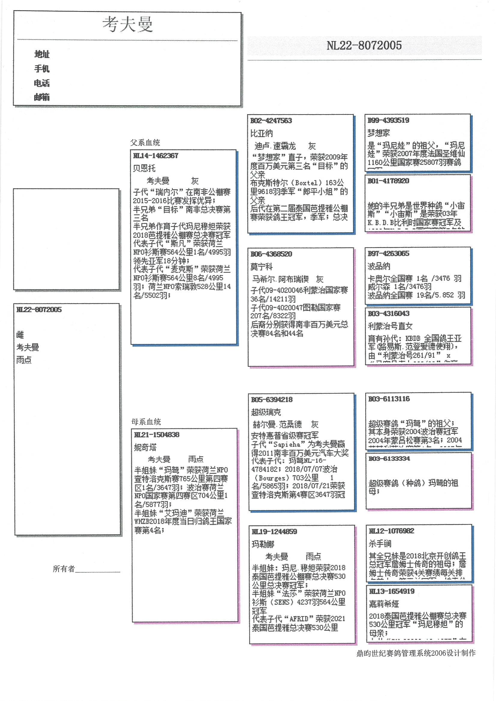 “玛弩” (NPO 查特鲁国家赛4区 3,647羽1名 - 19,192羽分速最高- NPO 波治国家赛4区 5,877羽1名 – 森斯 1,069羽1名) - “帕寇” (波治国家赛4区 5,877羽2名 - 查特鲁国家赛4区 3,647羽20名) – “艾玛迪” (WHZB/王中王长距离鸽王全国4位 ) - “阿菲德” (21年芭提雅公棚赛决赛 – 3,653羽8名) - “玛尼穆妲” (18年芭提雅公棚赛决赛1名)