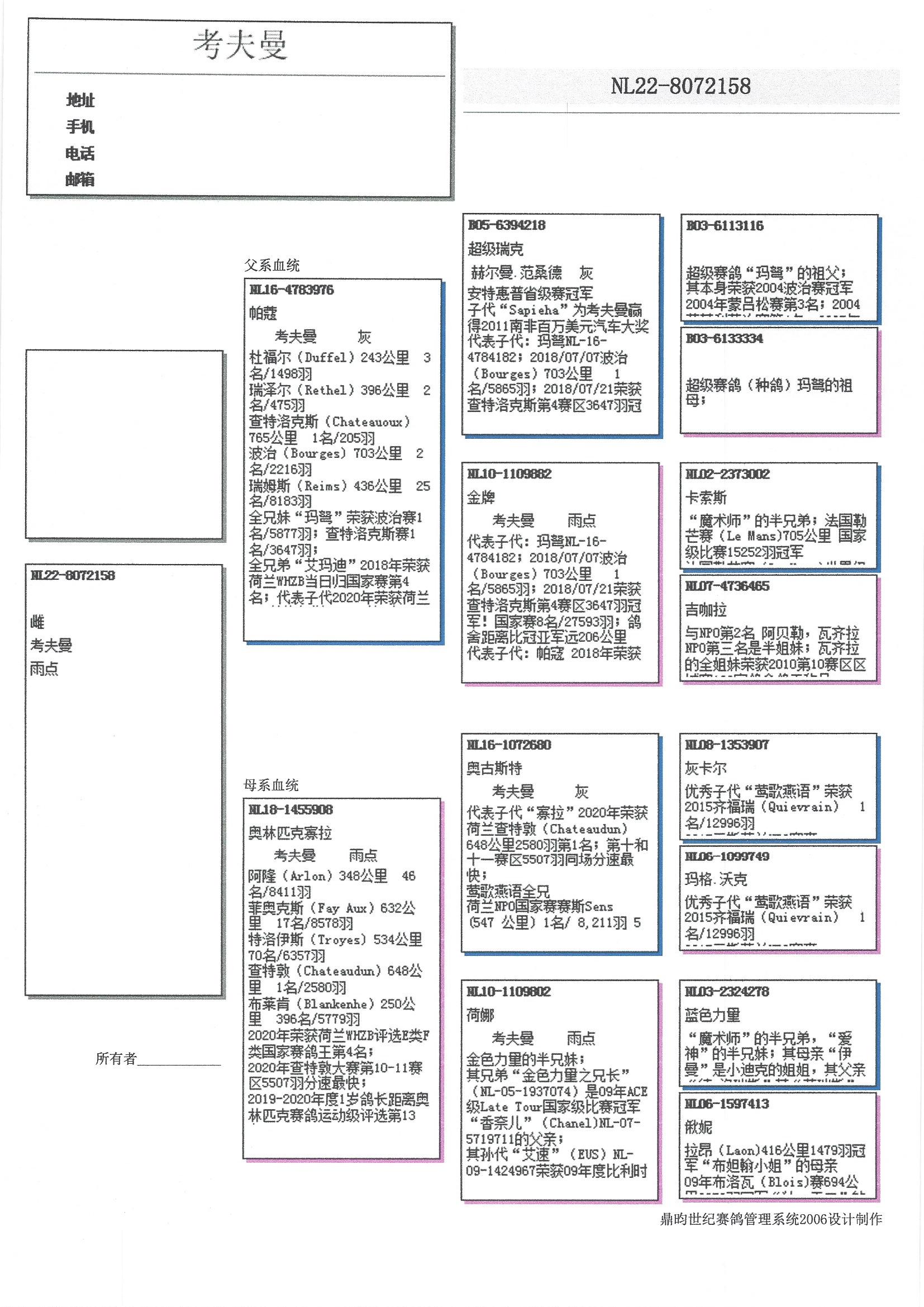 荣获: 20/21年奥林匹克一日长距离鸽王 - WHZB一日长距离鸽王全国4位  - NPO 查特顿 2,580羽1名 (分速 5,507羽1名) – 费奥罗治 8,578羽17名 – 亚侬 8,411羽46名 – 特洛伊 6,357羽70名