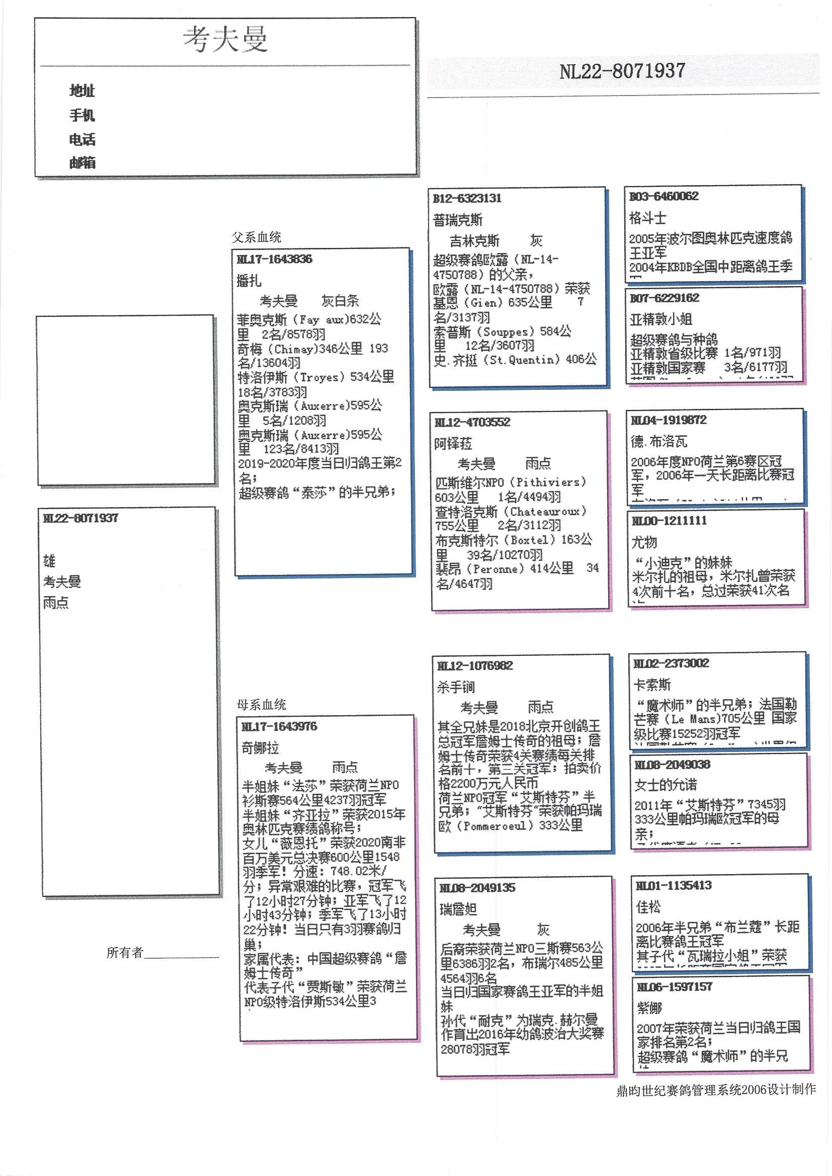 孙代代表及佳绩:“耐克” (波治国家赛 28,078羽1名,R. 贺尔曼使翔)以及“琪拉”(奥林匹克代表鸽)