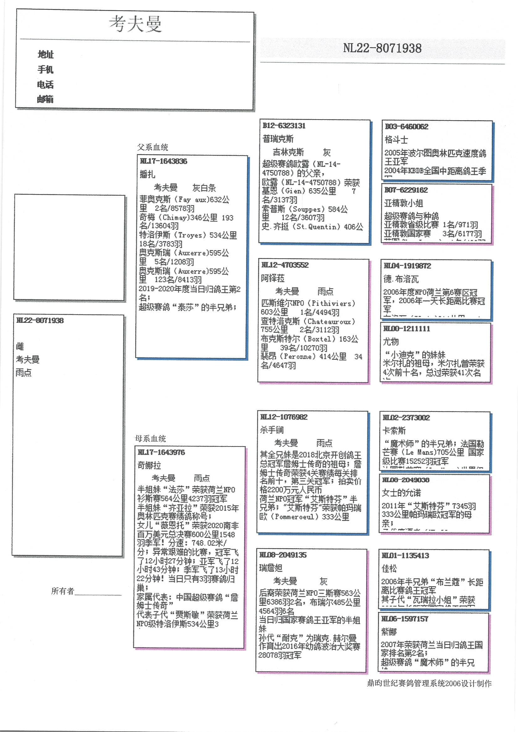 孙代代表及佳绩:“耐克” (波治国家赛 28,078羽1名,R. 贺尔曼使翔)以及“琪拉”(奥林匹克代表鸽)