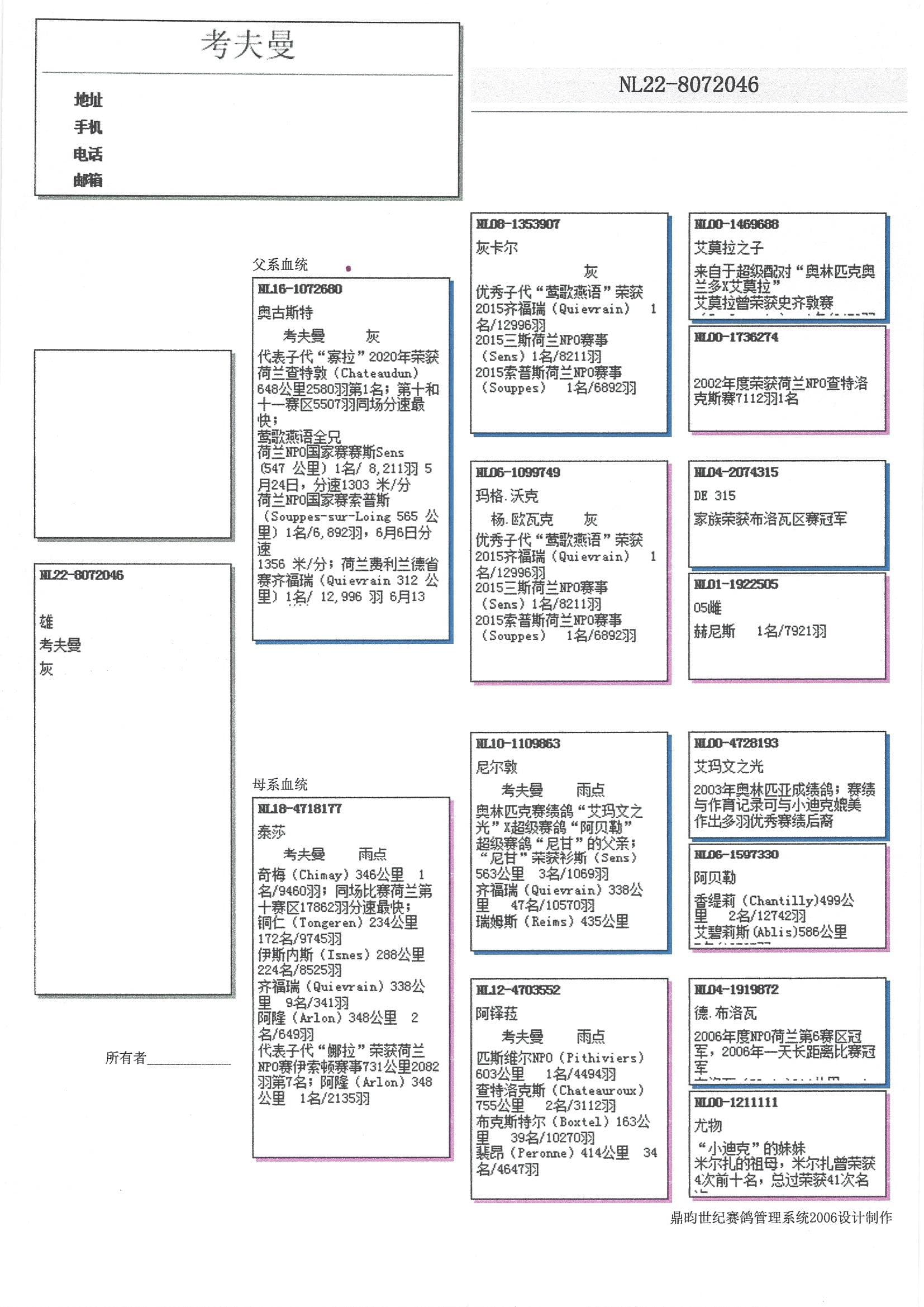 “莺歌燕语小姐” (荣获魁夫兰 12,996羽1名 – NPO 森斯 8,211羽1名- NPO 苏珀斯 6,892羽1名)之全兄弟
