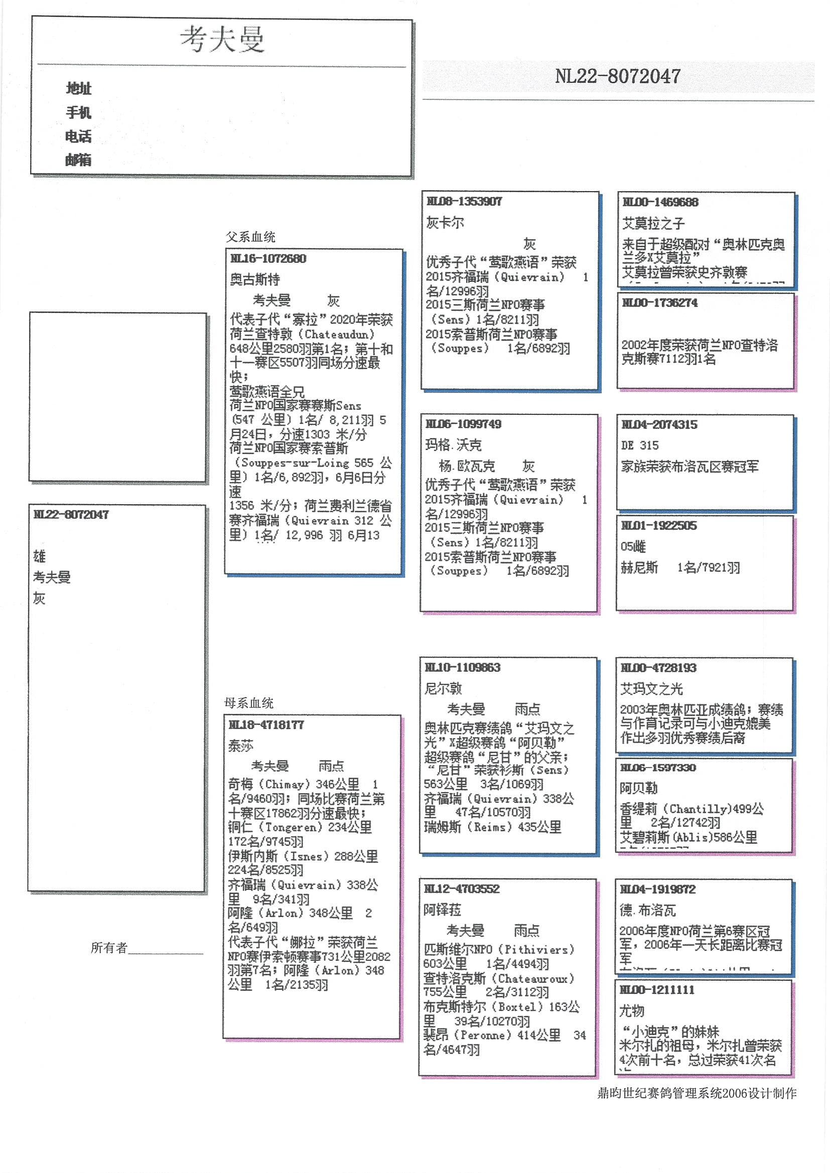 “莺歌燕语小姐” (荣获魁夫兰 12,996羽1名 – NPO 森斯 8,211羽1名- NPO 苏珀斯 6,892羽1名)之全兄弟