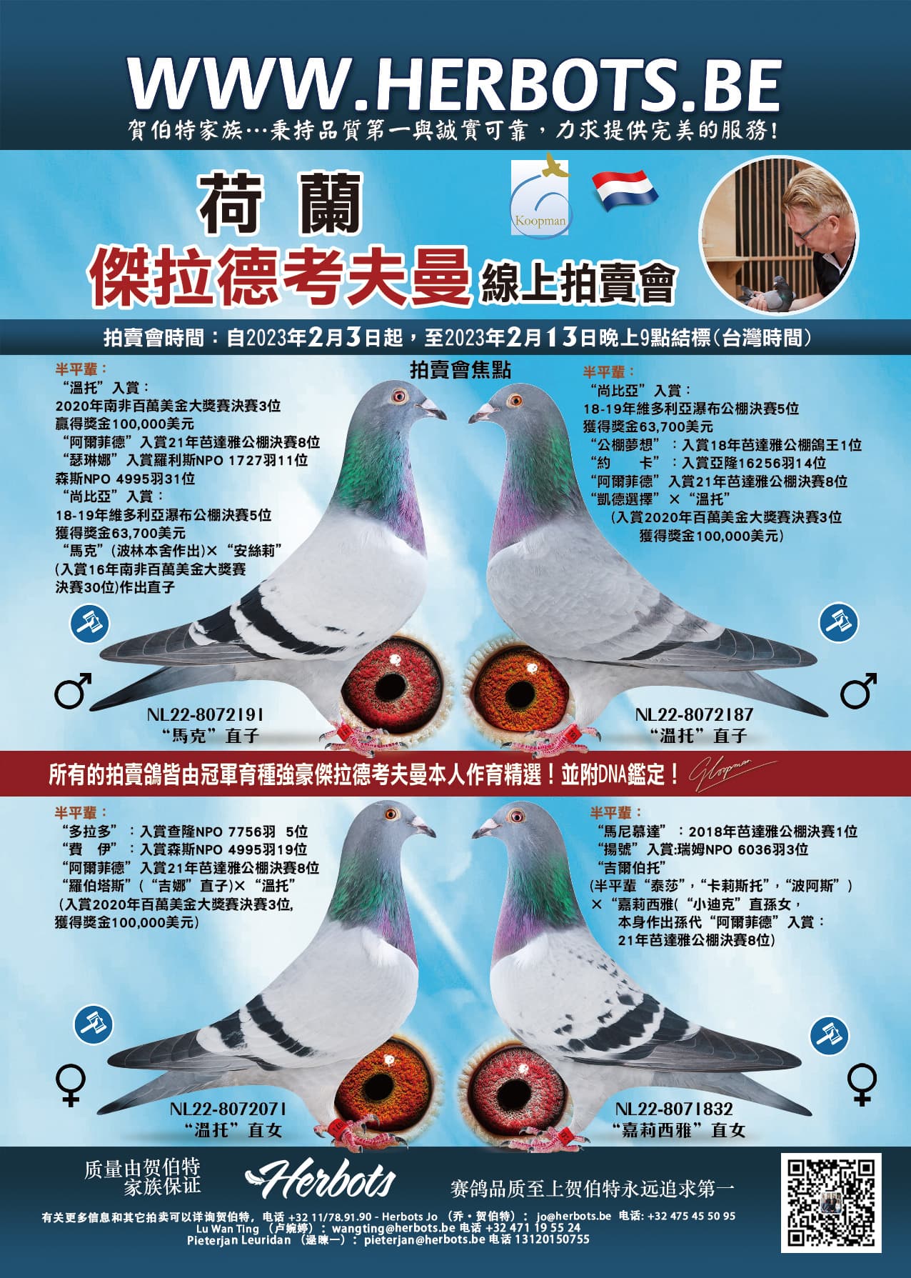 此期拍卖会中提供世界冠军吉拉德·考夫曼特别精选OLR顶级入赏鸽的下代!