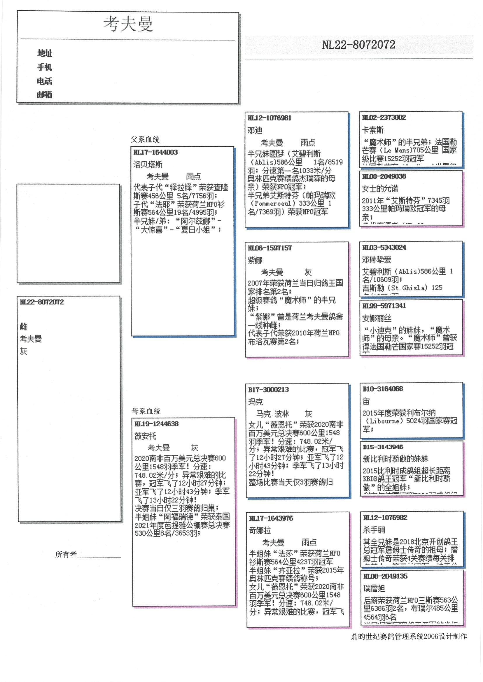 “宙” (莱邦纳国家赛 5,024羽1名 – 布瑞福国家赛 5,286羽7名 – 苏亚克国家赛 7,760羽18名 – 卡奥尔国家赛 6,576羽42名 – 图勒国家赛 5,976羽81名 – 利蒙治国家赛 14,271羽101名 等等) x “新比利时骄傲之姐妹”(全平辈“新比利时骄傲”荣获鸽王全国1位以及莱邦纳国家赛1名) 作出