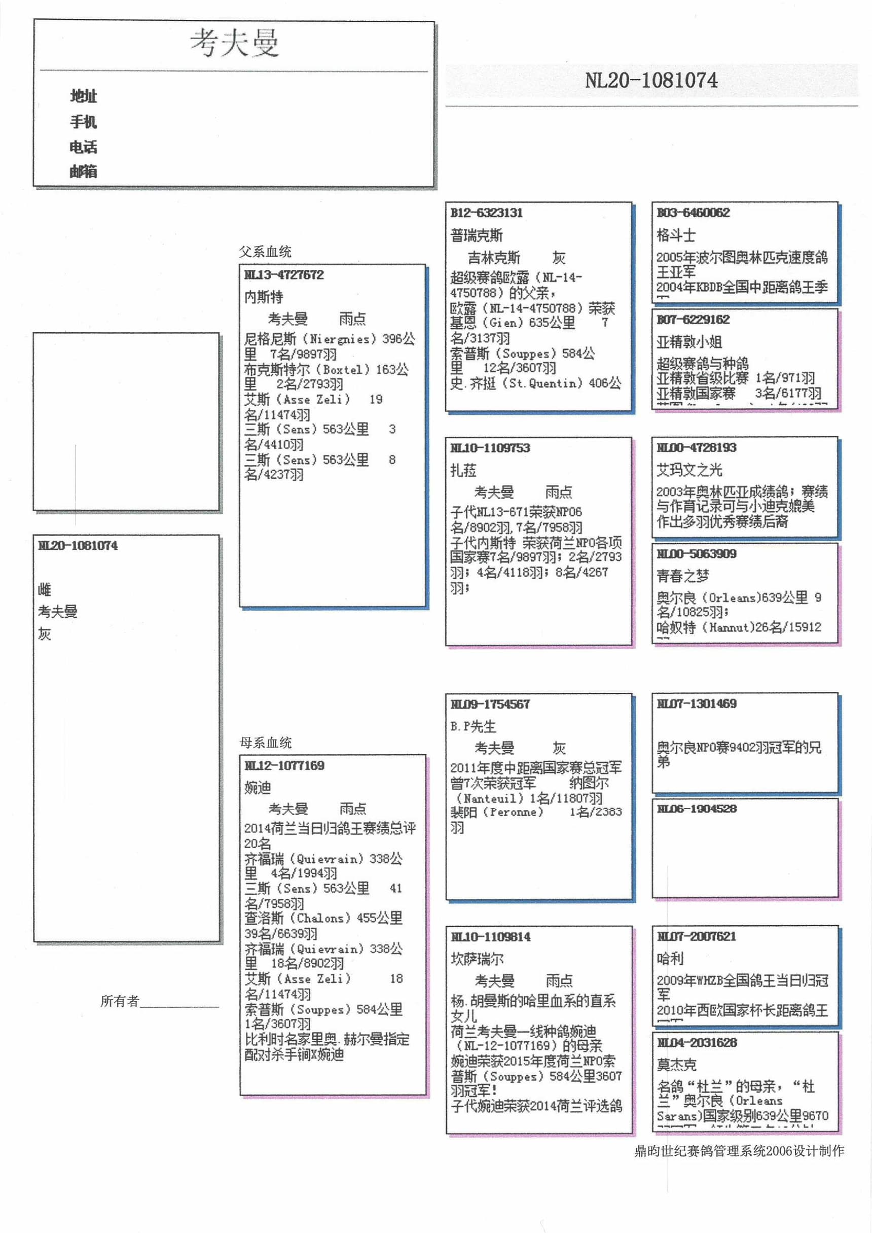 带DNA检验证书“婉迪”直女:荷兰NPO索普斯赛3607羽1名;“内斯特”直女: 2名/2793羽; 3名/4410羽; 7名/9897羽“BP先生”的孙女:“BP先生”2011年荷兰NPO中距离鸽王冠军;