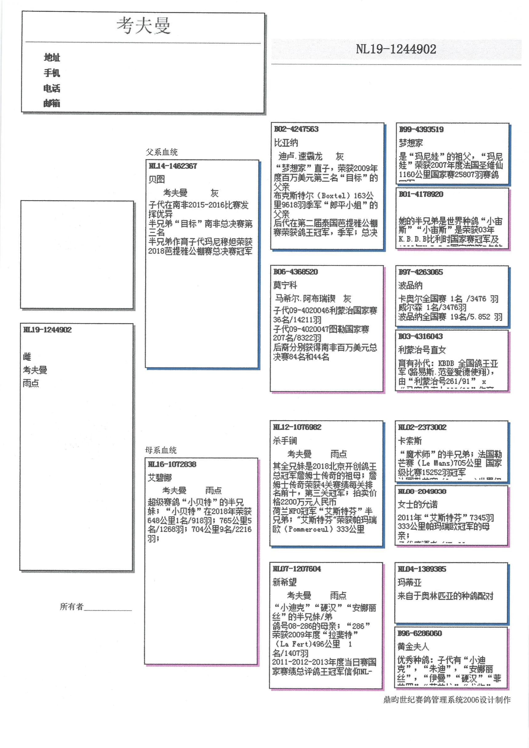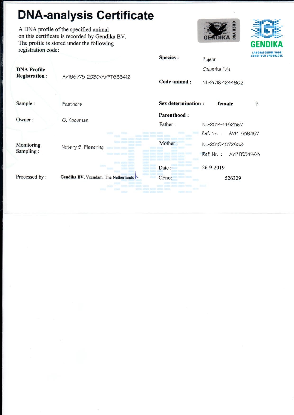 DNA 验证 “雷尼尔”(2015-2016年百万美元大奖赛顶级翔绩鸽)之半姐妹基础配对 “比亚内” x “莫妮克” 直孙女 “杀手锏” x “新希望” 直孙女