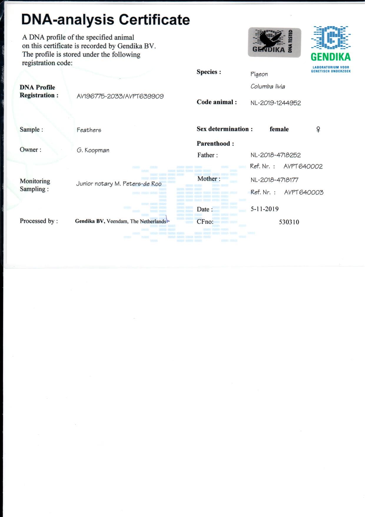 DNA 验证 “兄弟 x 姐妹” 配对作出 “泰莎”直女, “泰莎” 荣获:奇梅 9,460羽 1名 ( 17,862羽分速最高) “尼尔顿” x “泰莎”双重直孙女, “尼尔顿” x “泰莎”