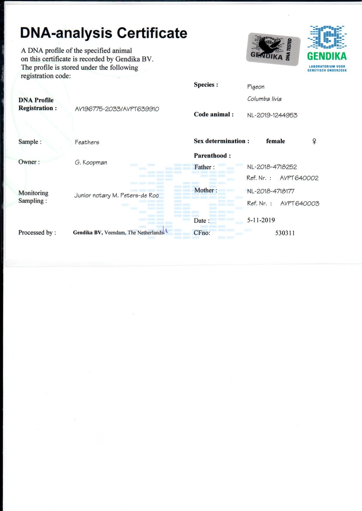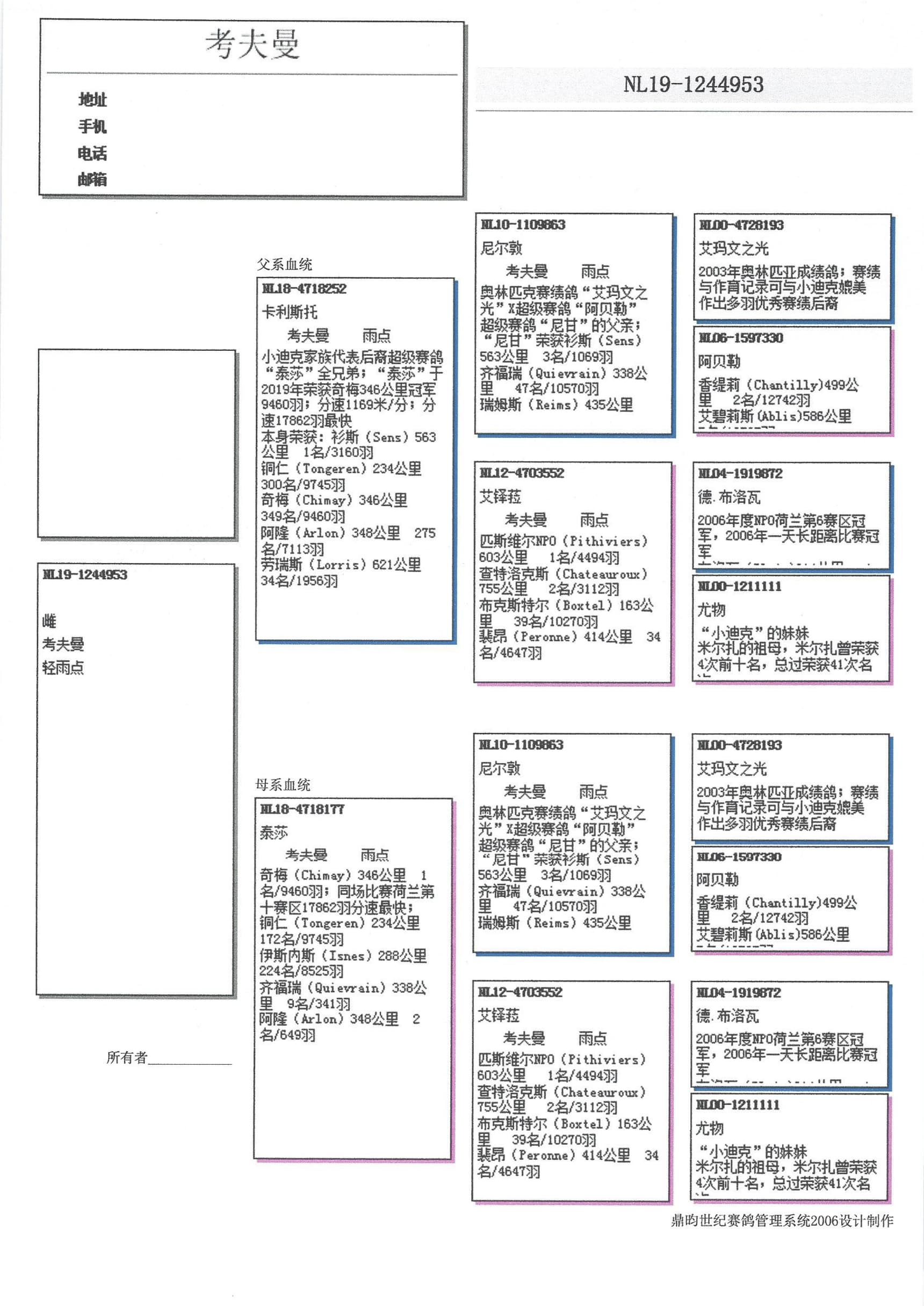 DNA 验证 “兄弟 x 姐妹” 配对作出 “泰莎”直女, “泰莎” 荣获:奇梅 9,460羽 1名 ( 17,862羽分速最高) “尼尔顿” x “泰莎”双重直孙女, “尼尔顿” x “泰莎”
