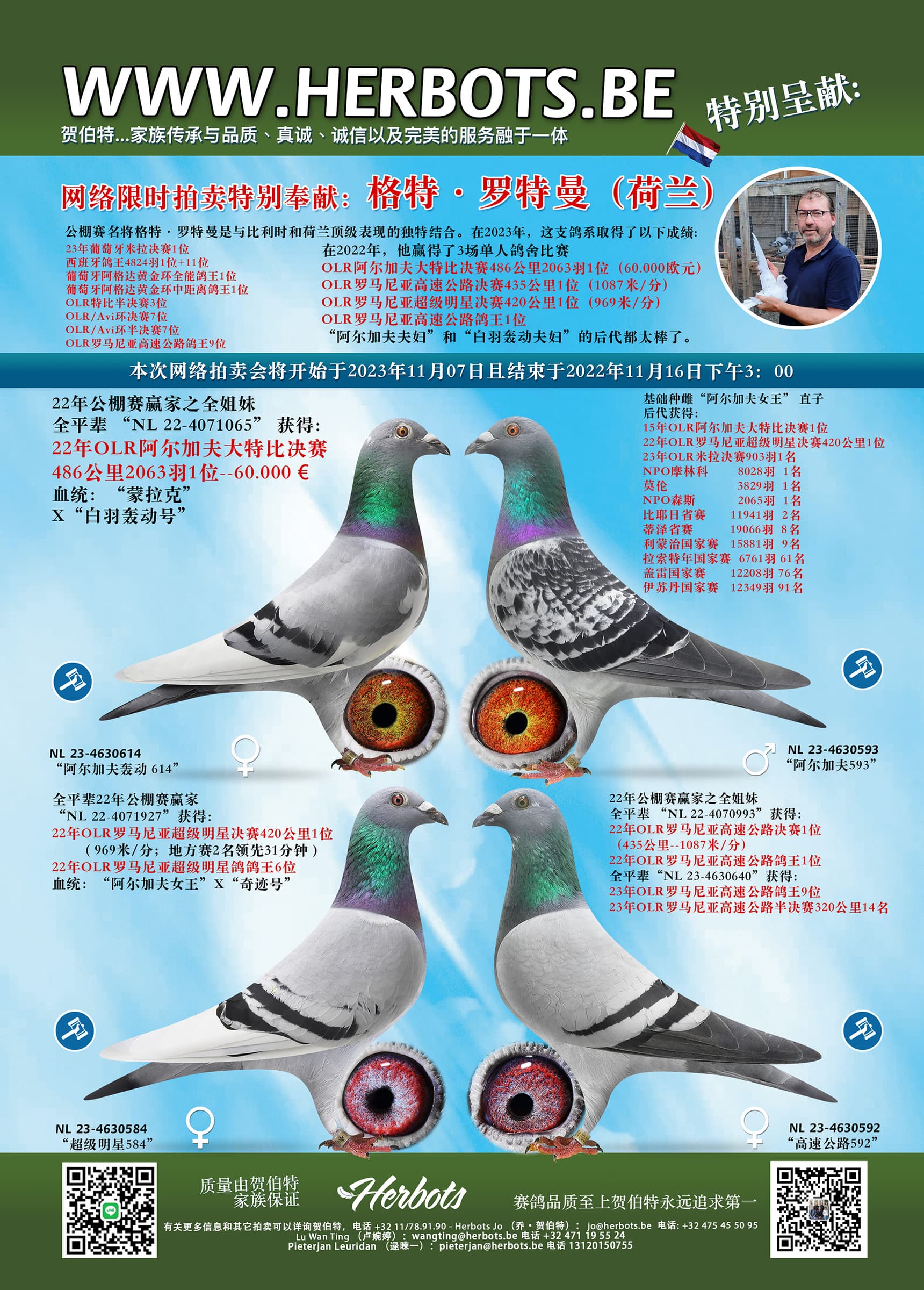 公棚赛名将格特·罗特曼是与比利时和荷兰顶级表现的独特结合。在2023年,这支鸽系取得了以下成绩: