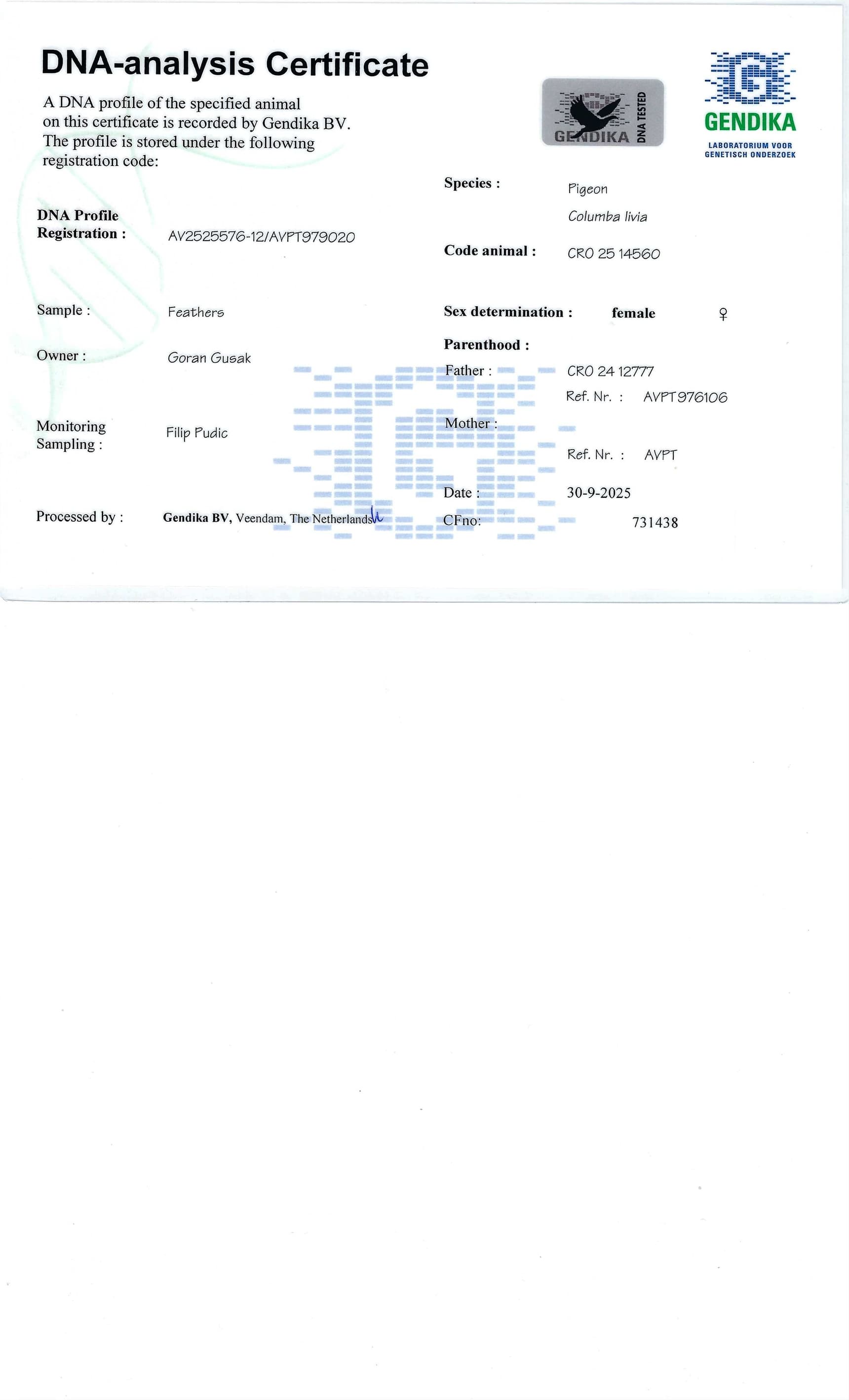 X“纳丁” (KBDB 鸽王全国1位– 丹尼尔斯 W.)作出