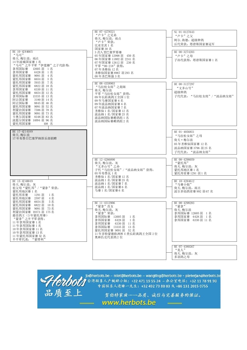 父亲:“BE 10-4284665马可” 14年波城国家赛904公里1910羽1名14年波城国际赛8295羽7名基础雌鸽“伊莲娜”之半兄弟母亲:“BE 15-4240049灰” “蒙拿”之孙女,“蒙拿”荣获:拿邦国际赛12605羽 1名拿邦国际赛13335羽 13名12年奥林匹克马拉松代表鸽2位