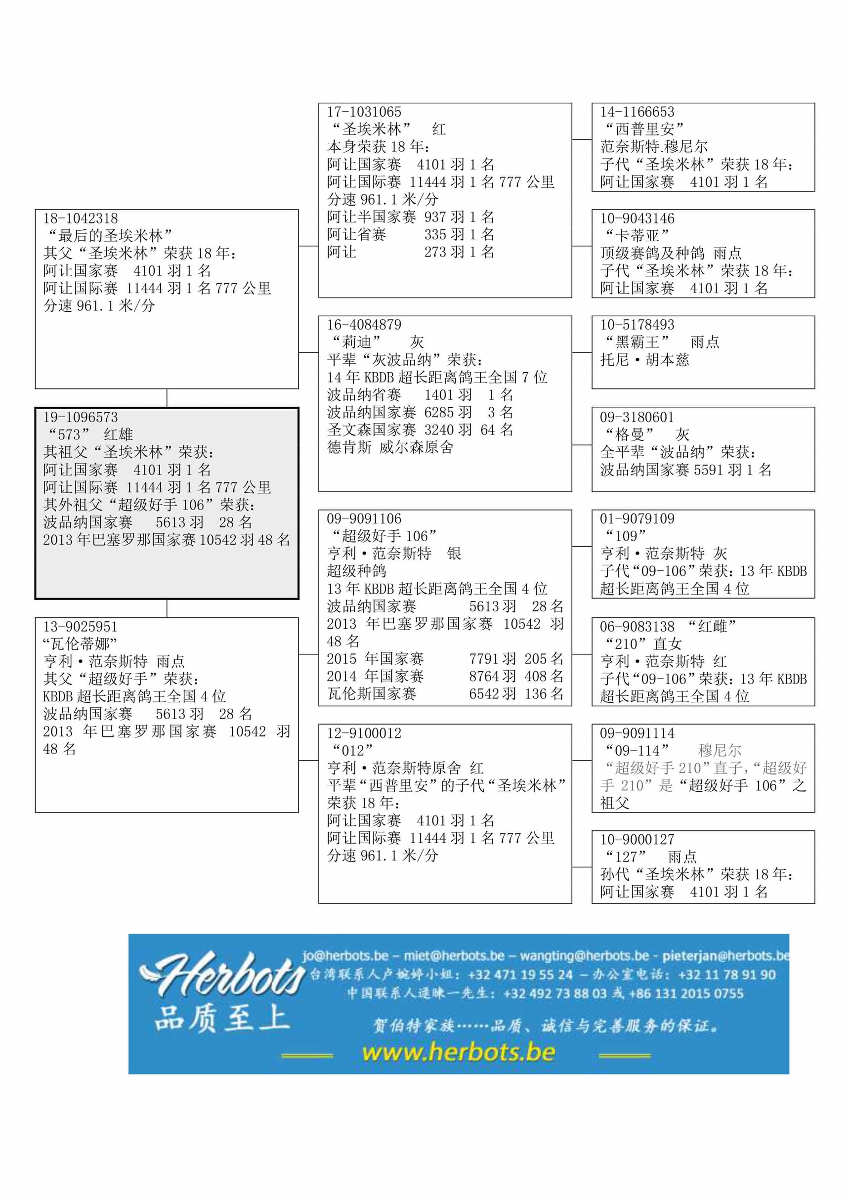 其祖辈 “圣埃米林” 荣获: 阿让国际赛 11,444羽 1名其祖辈 “超级好手 106” 荣获: 2013年KBDB马拉松鸽王全国4位