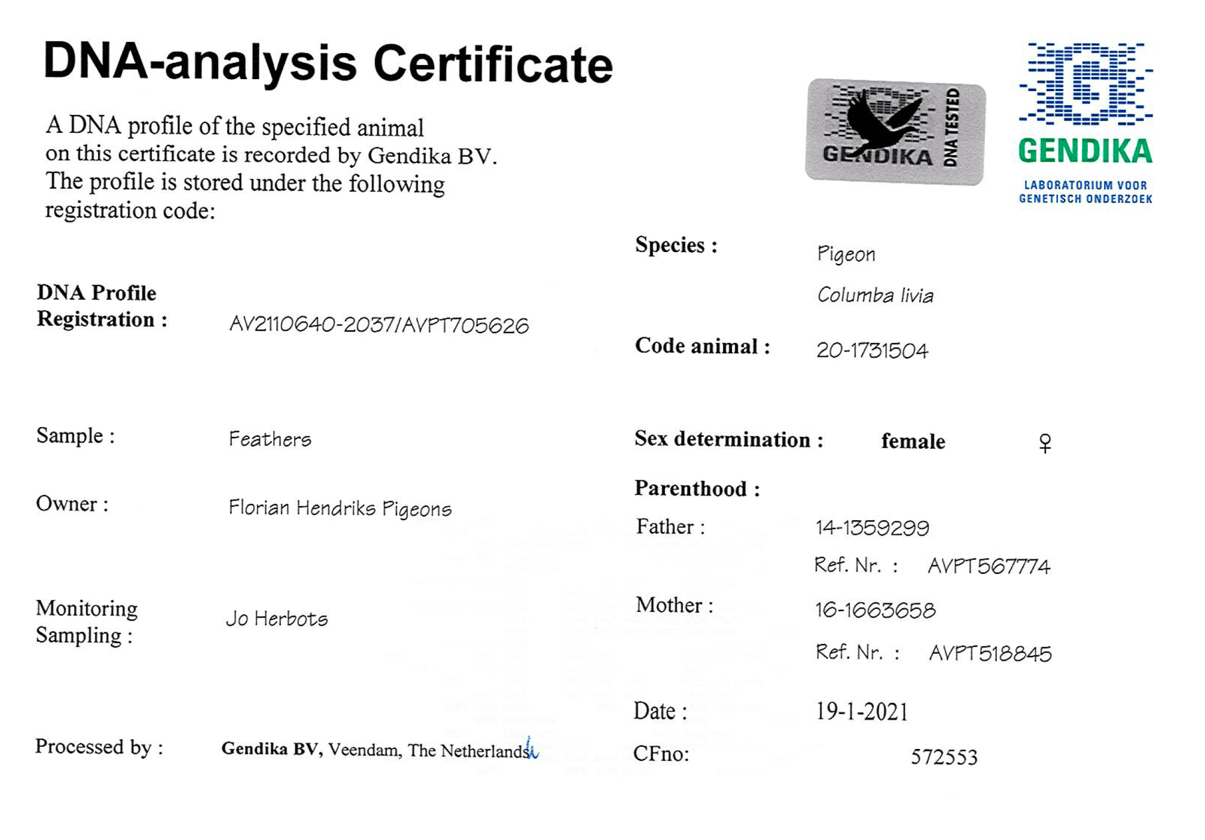 带DNA检验证书