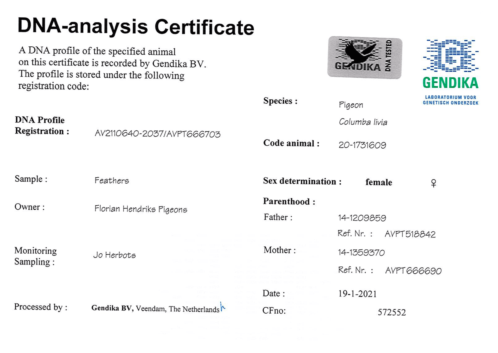 带DNA检验证书