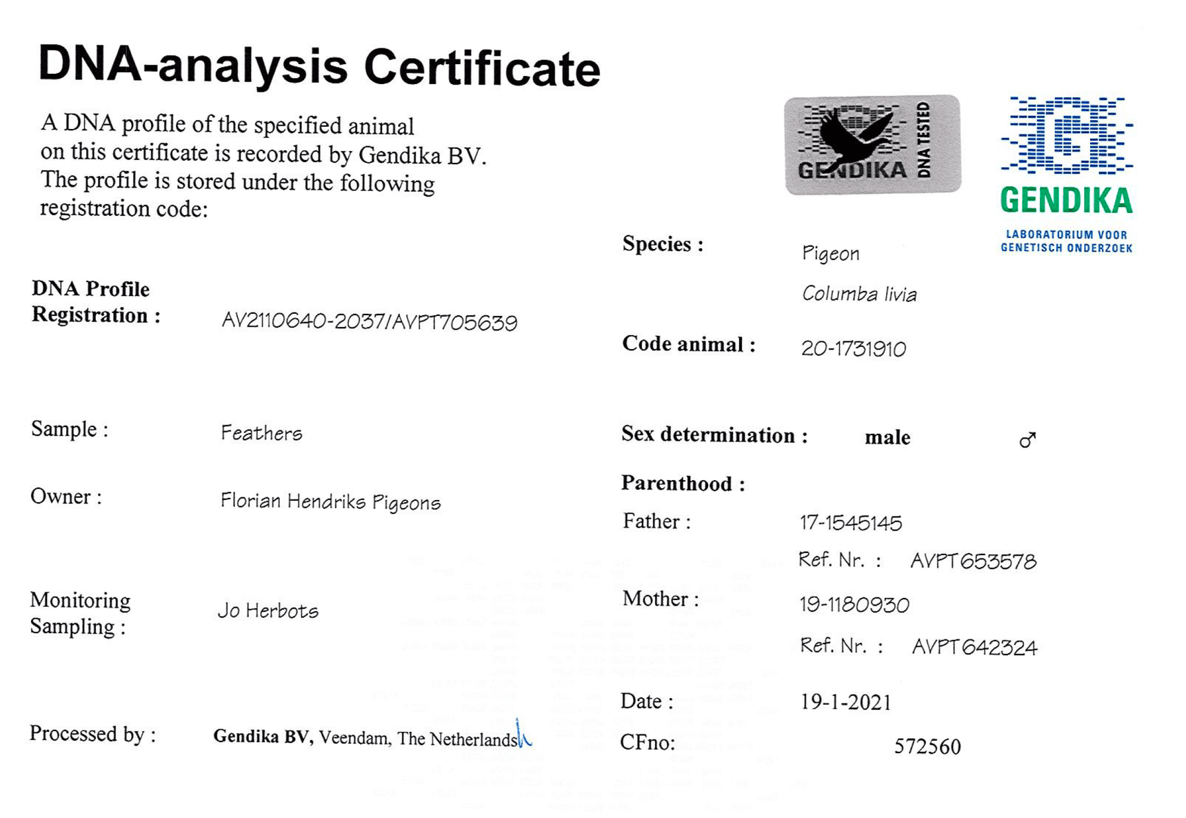 带DNA检验证书