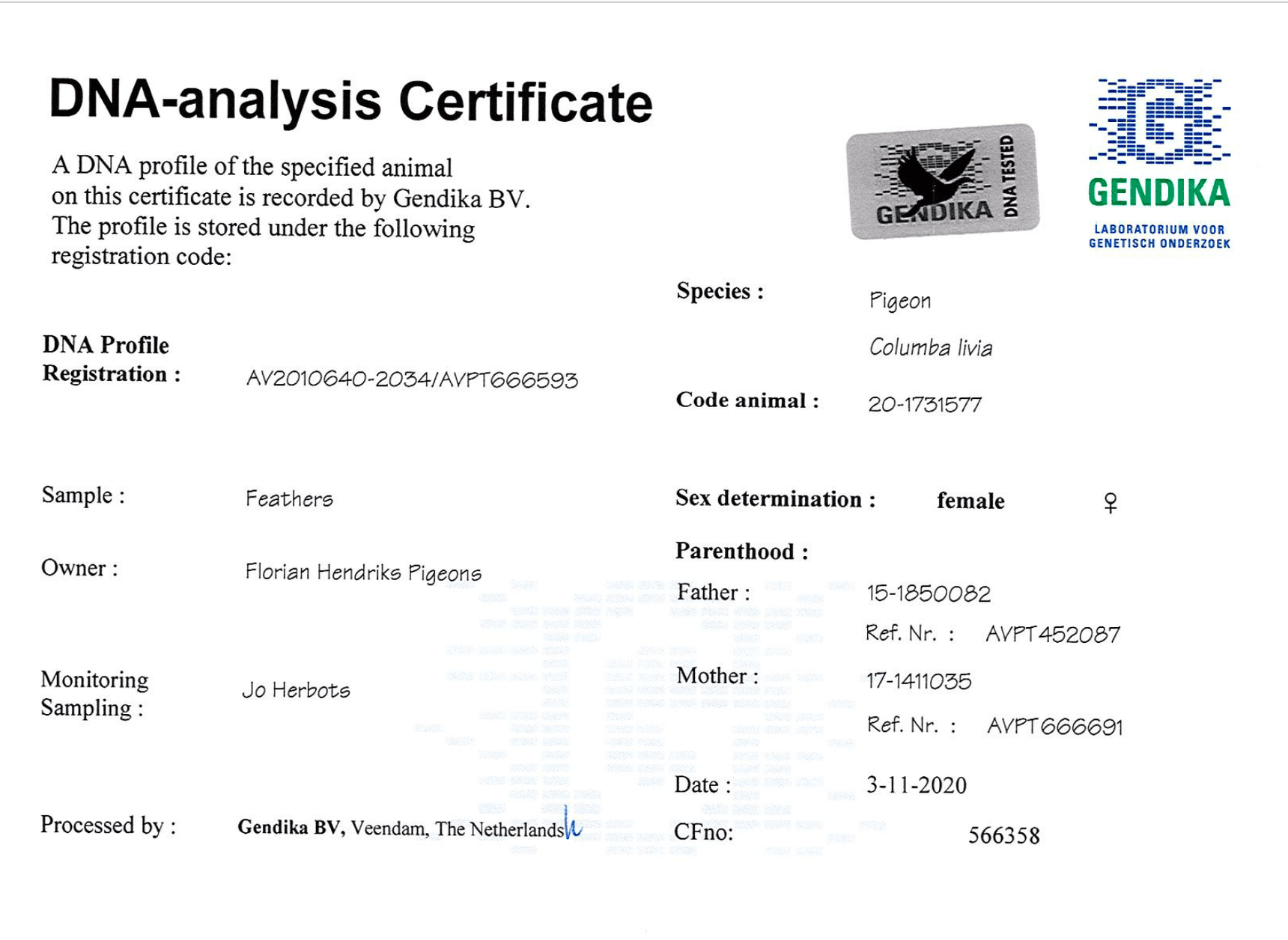 “400”(荣获:NPO中距离鸽王全国1位, 哈里·肯尼斯) 直孙女