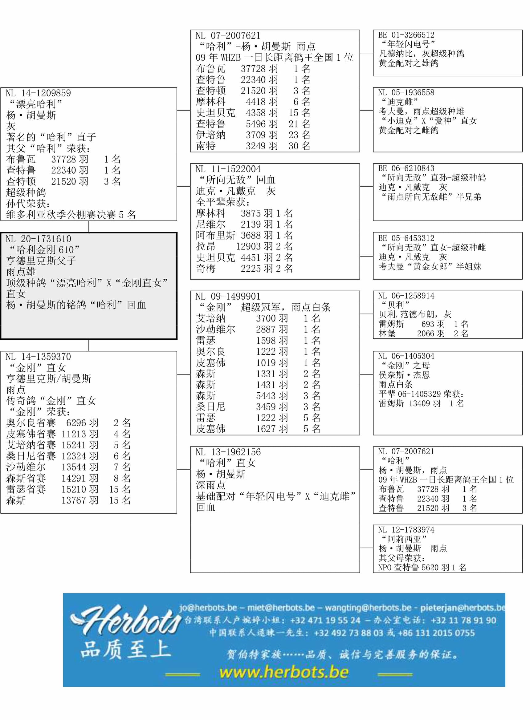 世界铭鸽 “哈利” (胡曼斯 J.) 直孙传奇鸽“金刚”直孙,“金刚”荣获: 奥尔良省赛 6,296羽2名 – 皮赛佛省赛 11,213羽4名 – 艾佩纳省赛 15,241羽5名 – 塞尚省赛 12,324羽6名 – 沙勒维尔省赛 13,544羽7名 – 森斯省赛 14,291羽8名