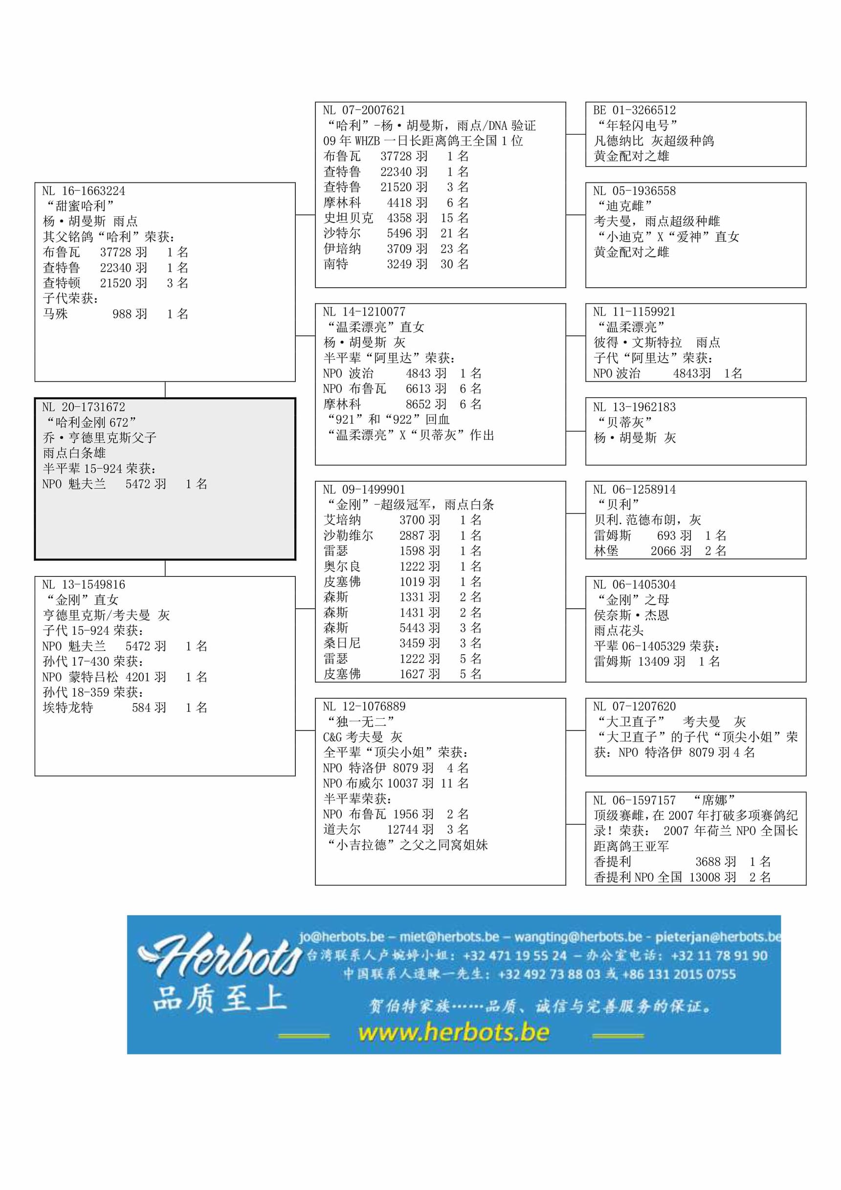 传奇鸽“金刚” (荣获: 奥尔良省赛 6,296羽2名 – 皮赛佛省赛 11,213羽4名 – 艾佩纳省赛 15,241羽5名 – 塞尚省赛 12,324羽6名 – 沙勒维尔省赛 13,544羽7名 – 森斯省赛 14,291羽8名) 直孙