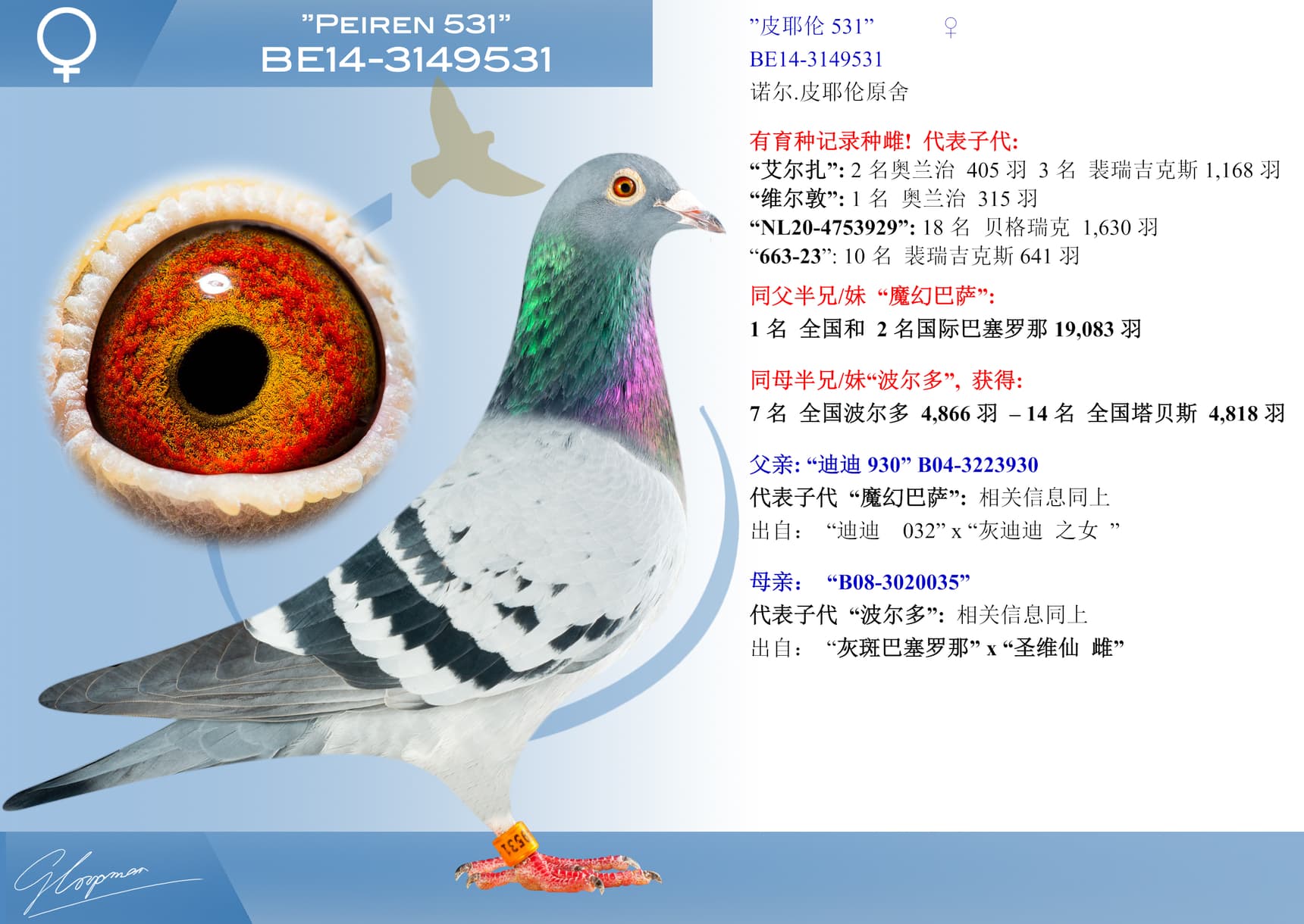 其祖辈“红鸽王”荣获: