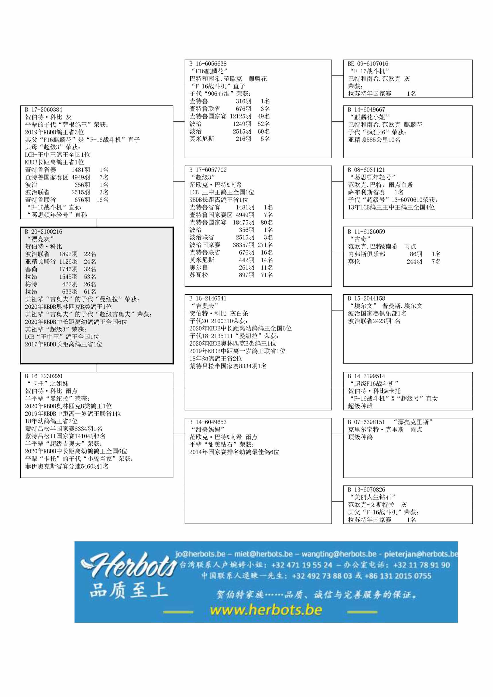 其祖辈冠军种鸽“吉奥夫”的子代代表及佳绩: “曼纽拉”(2020年奥林匹克B类鸽王) – “超级吉奥夫” (2020年幼鸽鸽王全国6位)