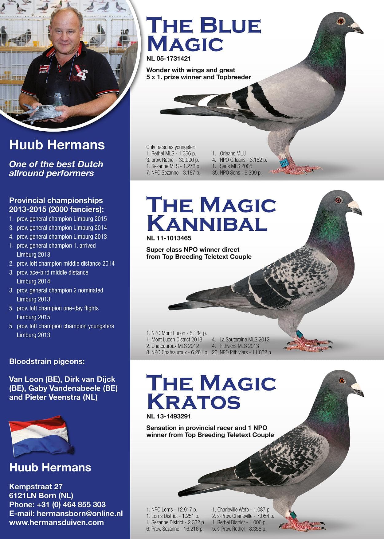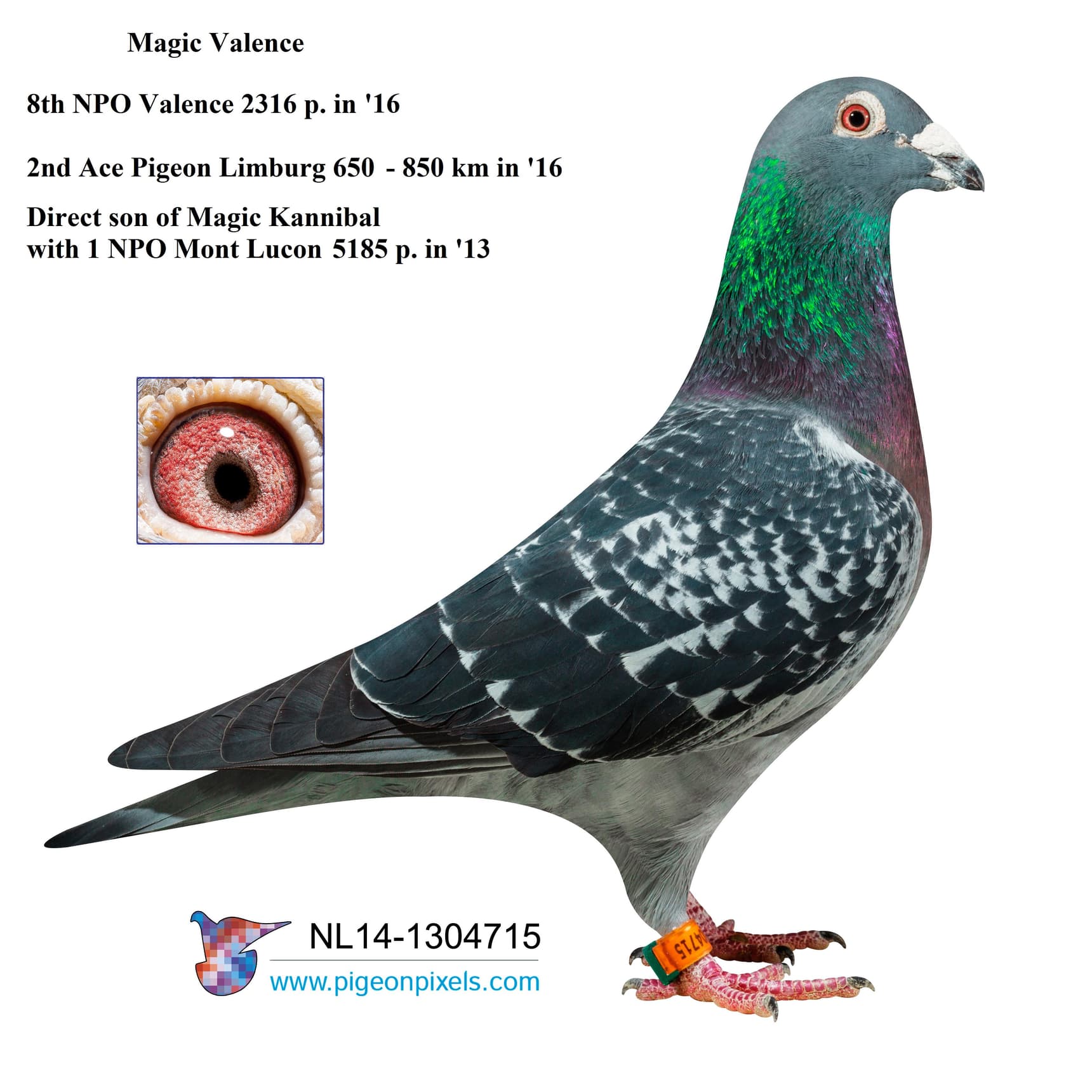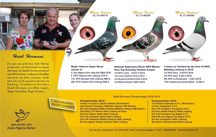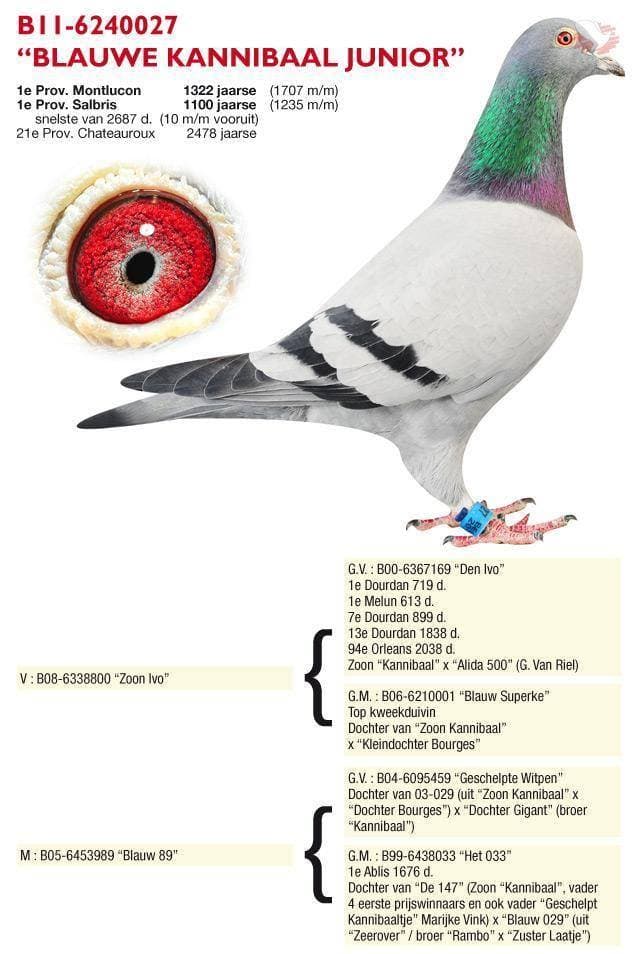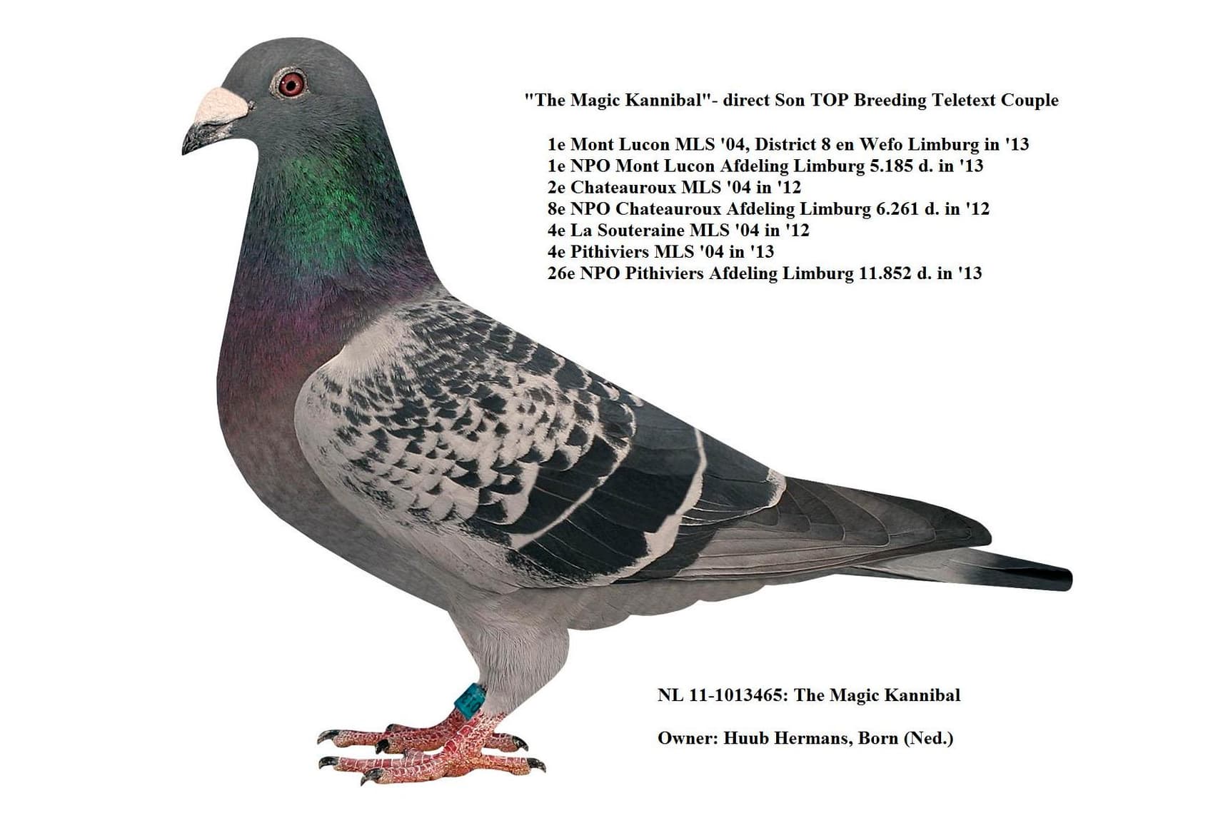 “魔力所向无敌” (荣获, 无重复计算:NPO 5,185羽1名, NPO 6,261羽8名, NPO 11,852羽26名) x “霹雳玛丹娜 2” (出自马拉松鸽王全国1位 X 长距离鸽王全国1位 – 皮特·文斯特拉原舍) 直子