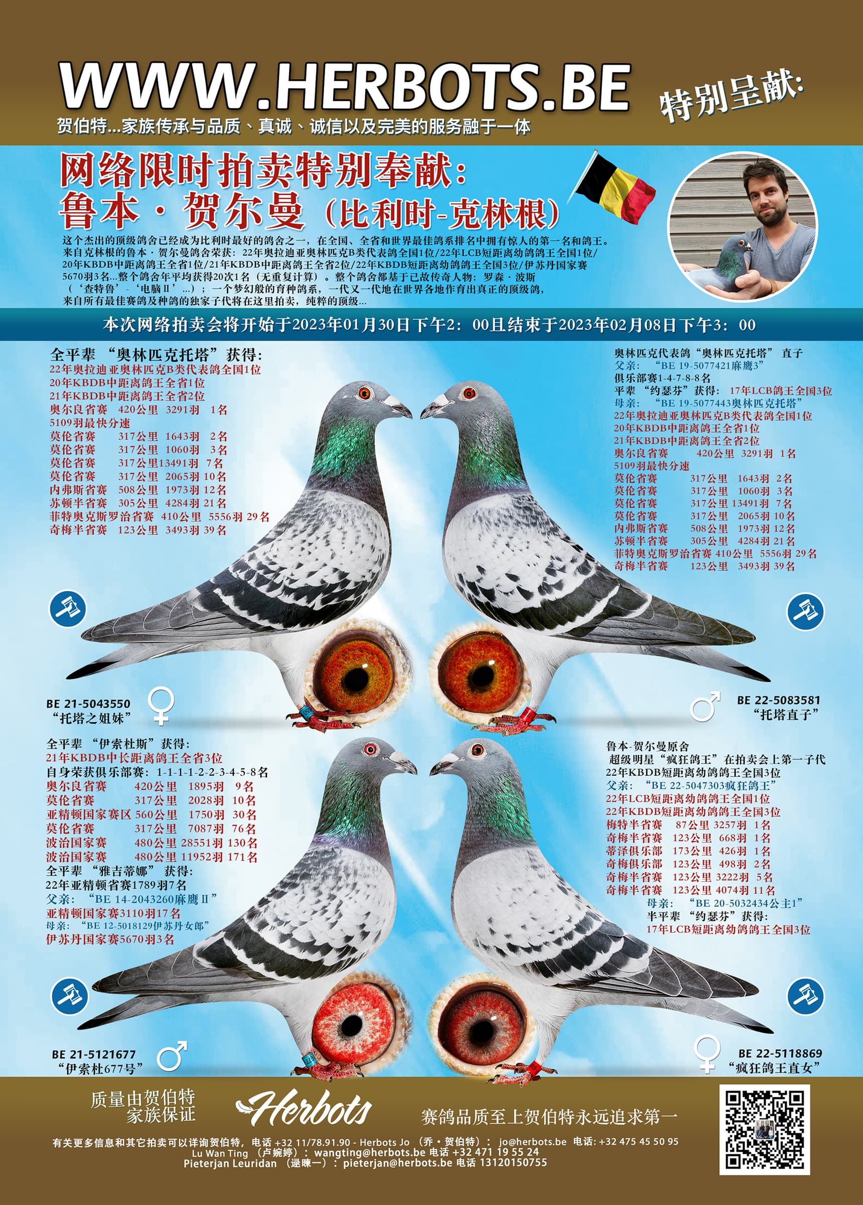 这个杰出的顶级鸽舍已经成为比利时最好的鸽舍之一,在全国、全省和世界最佳鸽系排名中拥有惊人的第一名和鸽王。来自克林根的鲁本·贺尔曼鸽舍荣获:22年奥拉迪亚奥林匹克B类代表鸽全国1位/22年LCB短距离幼鸽鸽王全国1位/20年KBDB中距离鸽王全省1位/21年KBDB中距离鸽王全省2位/22年KBDB短距离幼鸽鸽王全国3位/伊苏丹国家赛5670羽3名...整个鸽舍年平均获得20次1名(无重复计算)。整个鸽舍都基于已故传奇人物:罗森·波斯(‘查特鲁’-‘电脑Ⅱ’...);一个梦幻般的育种鸽系,一代又一代地在世界各地作育出真正的顶级鸽,来自所有最佳赛鸽及种鸽的独家子代将在这里拍卖,纯粹的顶级...