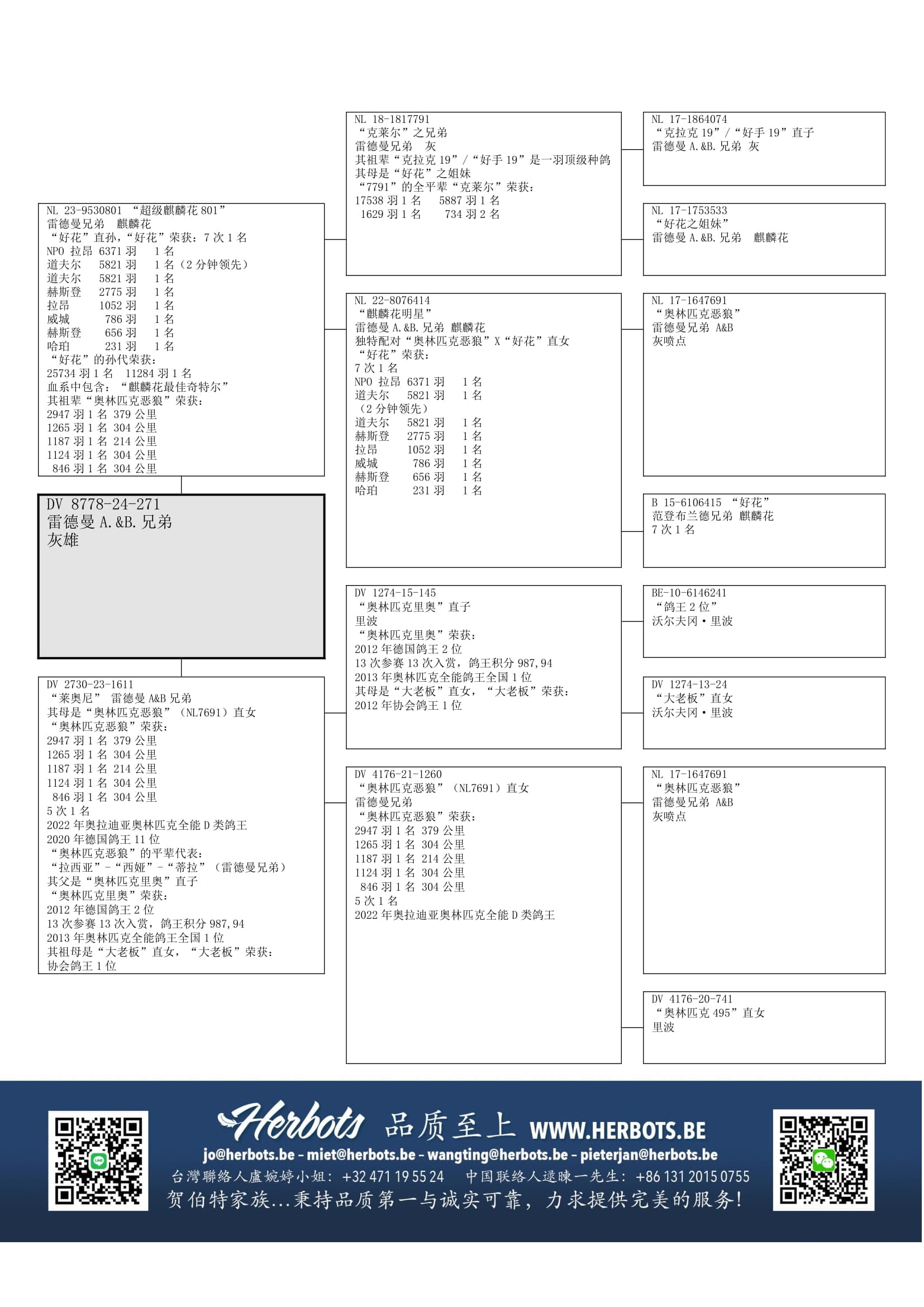 “奥林匹克恶狼” (2,947羽1名 – 1,265羽1名- 1,187羽1名 –1,124羽1名 – 846羽1名) x 世界铭鸽“好花” (7 次1名;冠军种鸽)作出