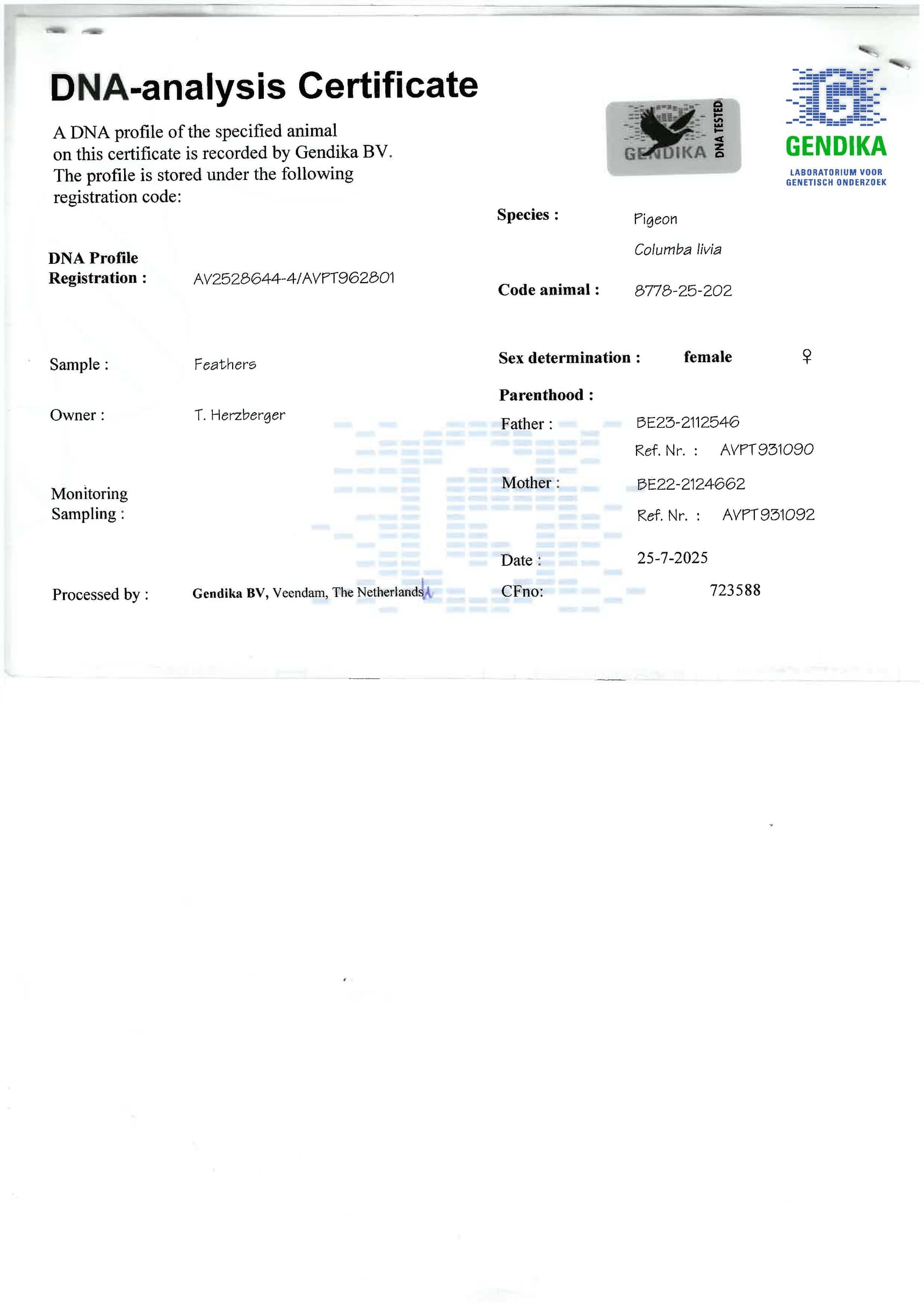 世界铭鸽“奥林匹克黎哥” B20-5031856双重直孙女