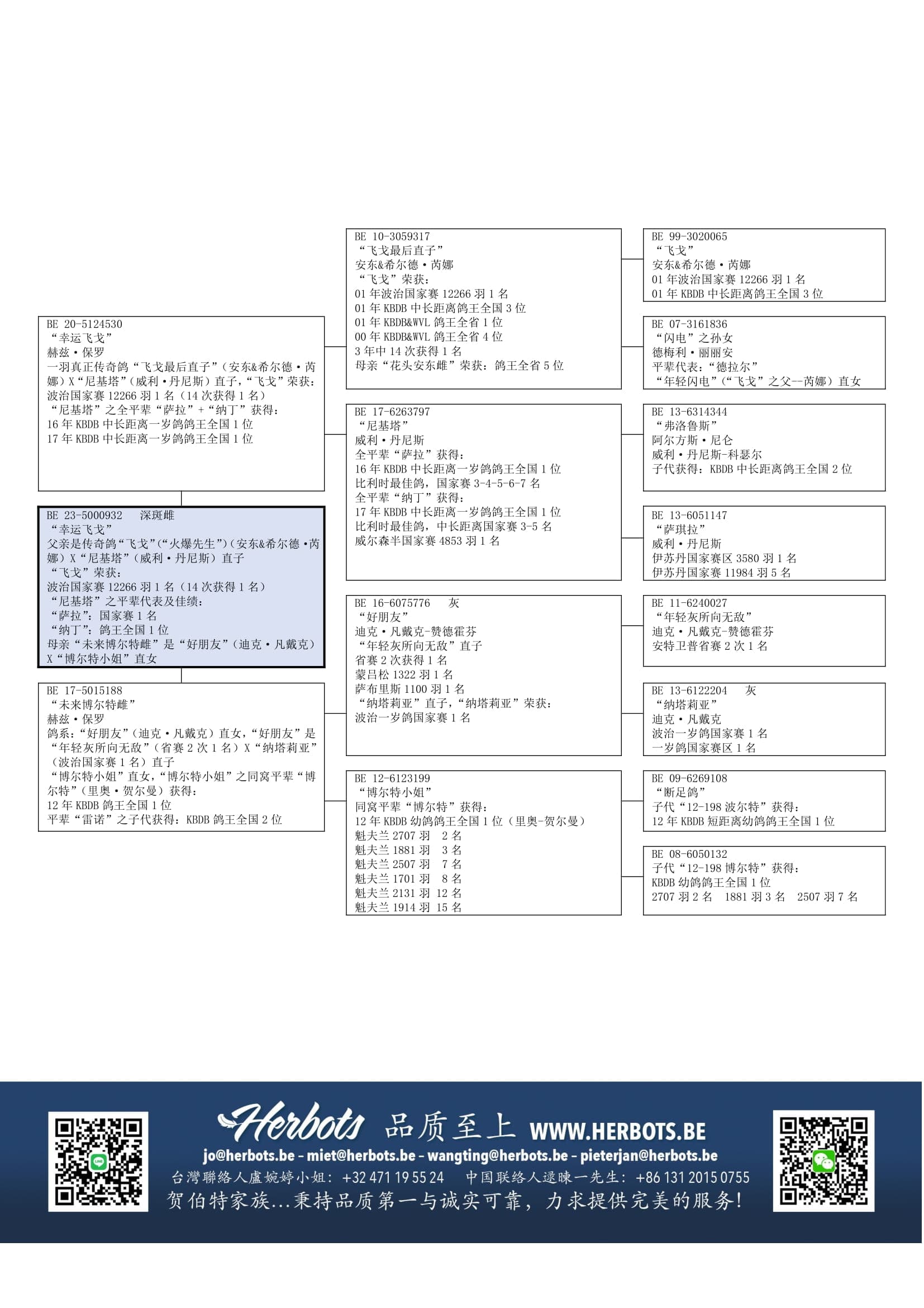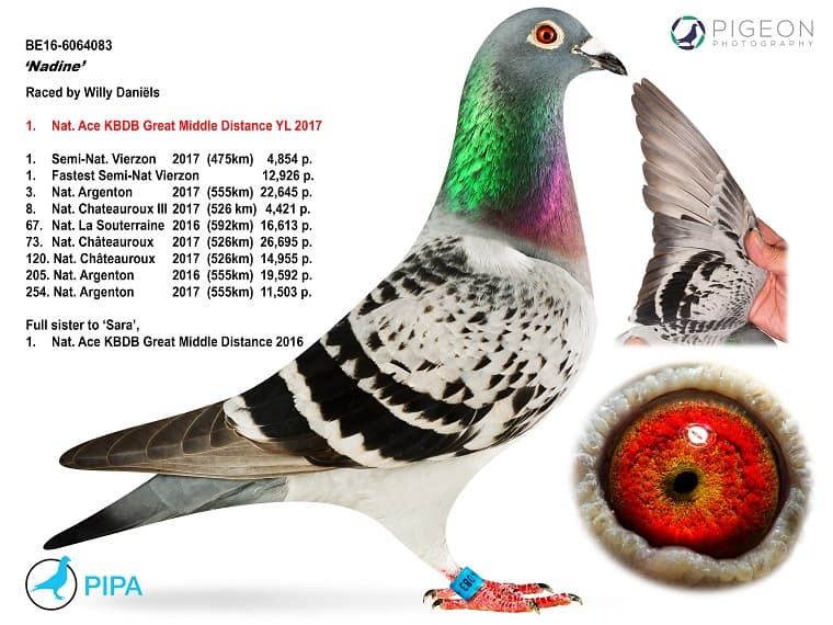 16 次 1 名;波治国家赛 1 名;16 年 KBDB 中长距离鸽王全国 3 位“尼基塔” B17-6263797 – 威利·丹尼斯原舍全平辈名鸽“纳丁”获得: