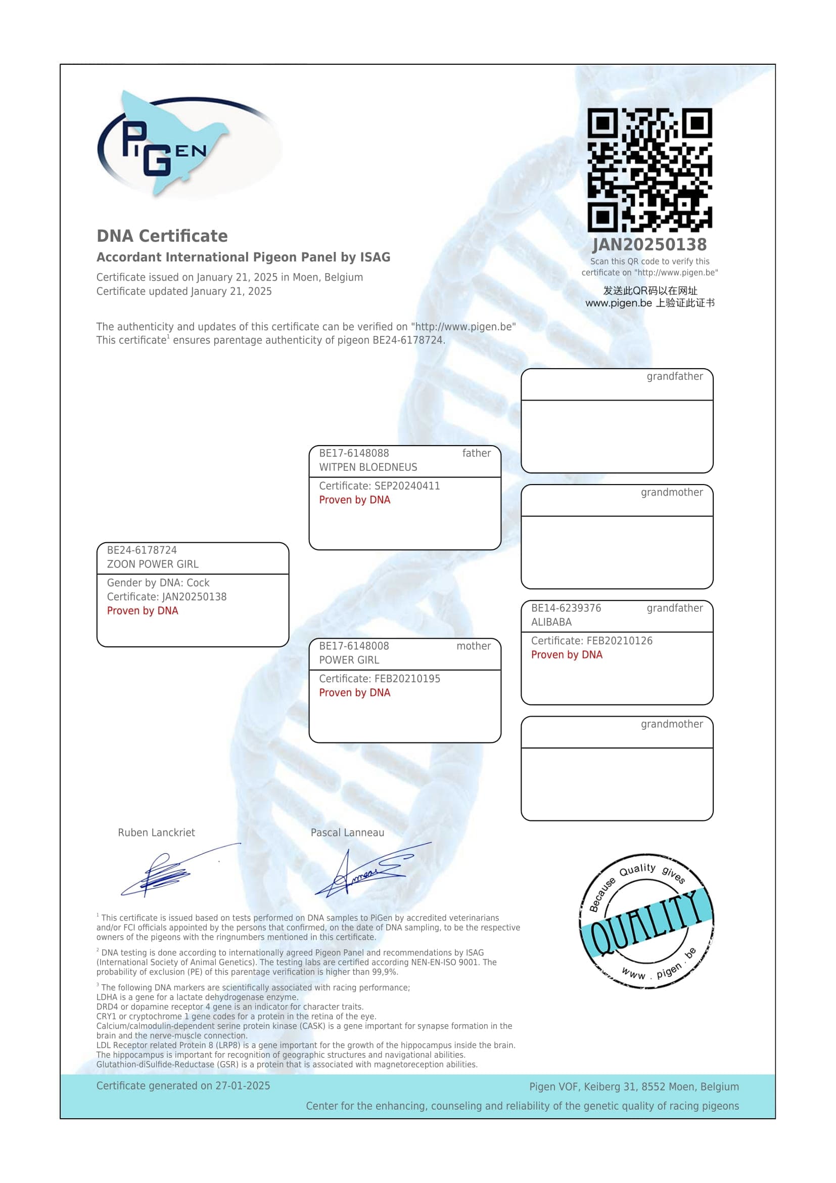“雷姆斯” (莫伦 3,974羽1名;省赛分速 7,769羽1名– 魁夫兰513羽1名 - 舍雷 1,179羽1名 – 莫伦 851羽3名 -KBDB中距离幼鸽最佳鸽舍全国2位成员)