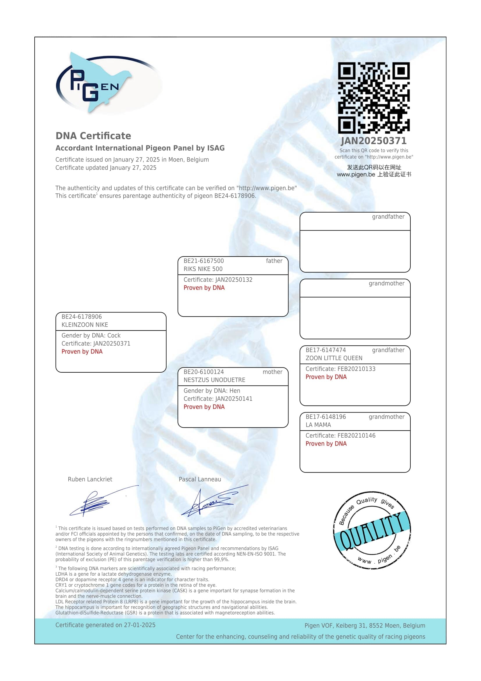 子代荣获: KBDB鸽王全国8位 ;国家赛54名, 61名, 66名和77名