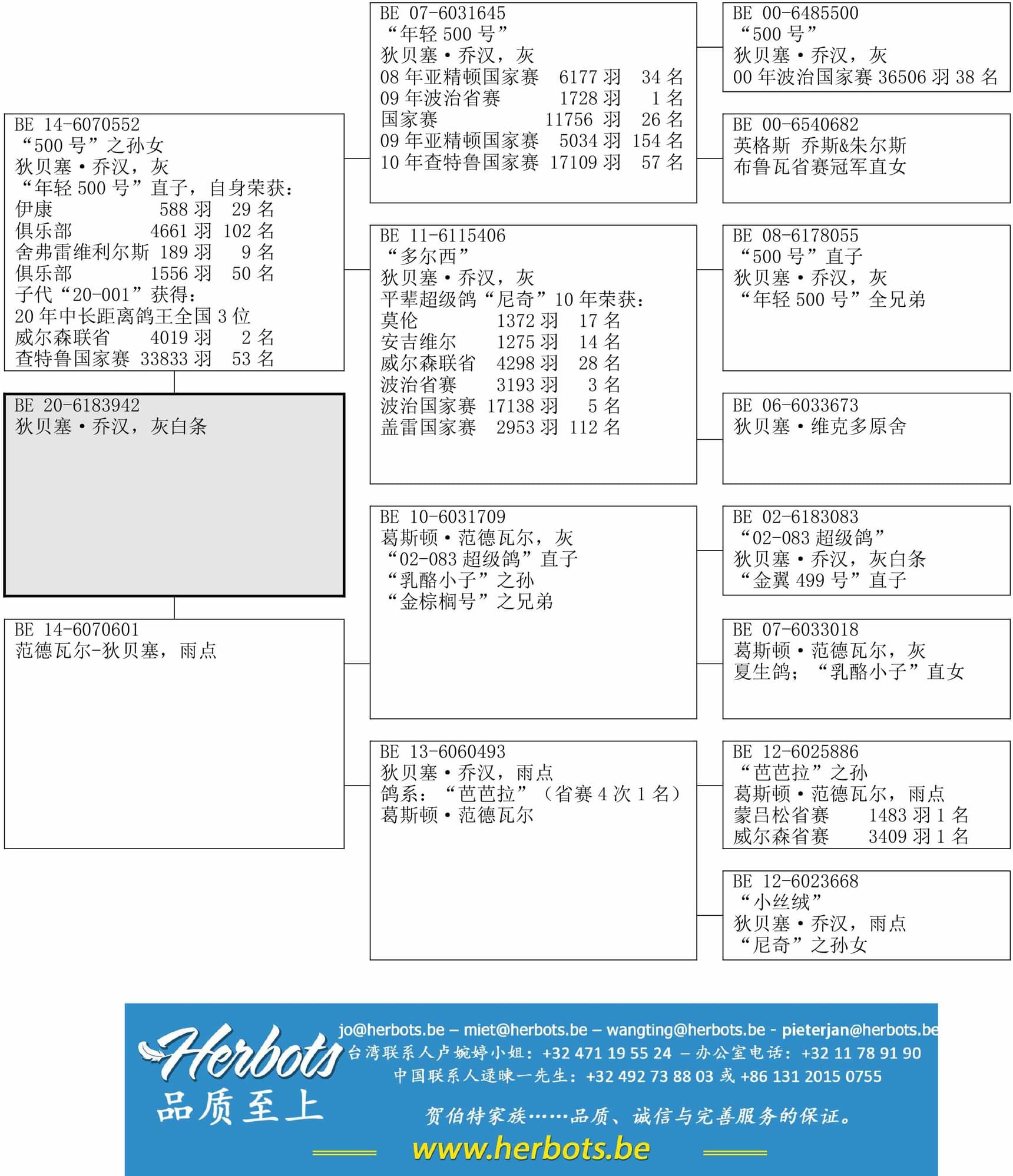 半平辈“001号”(同母)获得:20年KBDB 中长距离鸽王全国3位威尔森联省 4019羽 2名亚精顿国家赛 26085羽 21名查特鲁国家赛 33833羽 53名拉索特年国家赛 15939羽 62名“美好号”之孙女,其全平辈“尼奇”获得:波治国家赛17138羽5名“年轻500号”之孙女,“年轻500号”荣获:波治省赛1728羽1名国家赛11756羽26名