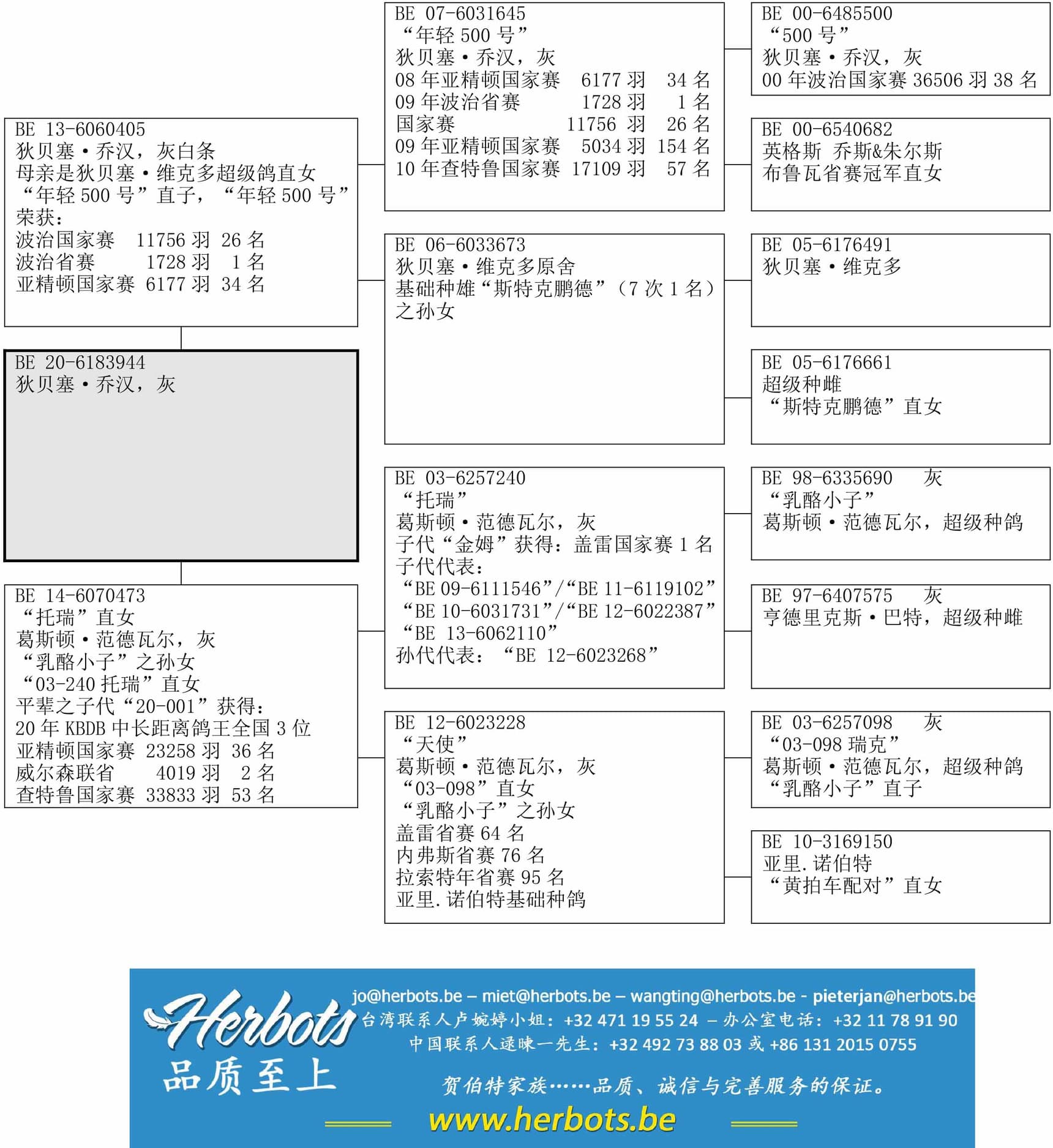 ‘托瑞’ BE03-6257240 之孙女 葛斯顿·范德瓦尔原舍‘奶酪小子’最佳儿子 ‘托瑞’ 子代‘金姆’ 荣获盖雷国家赛冠军母亲之姐妹是’001’之母‘001’ 荣获2020年KBDB大中距离鸽王全国季军维尔森联省赛 4019羽 2名亚精顿国家赛 26085羽 21名查特鲁国家赛 33833羽 53名拉苏特年国家赛 15939羽 62名