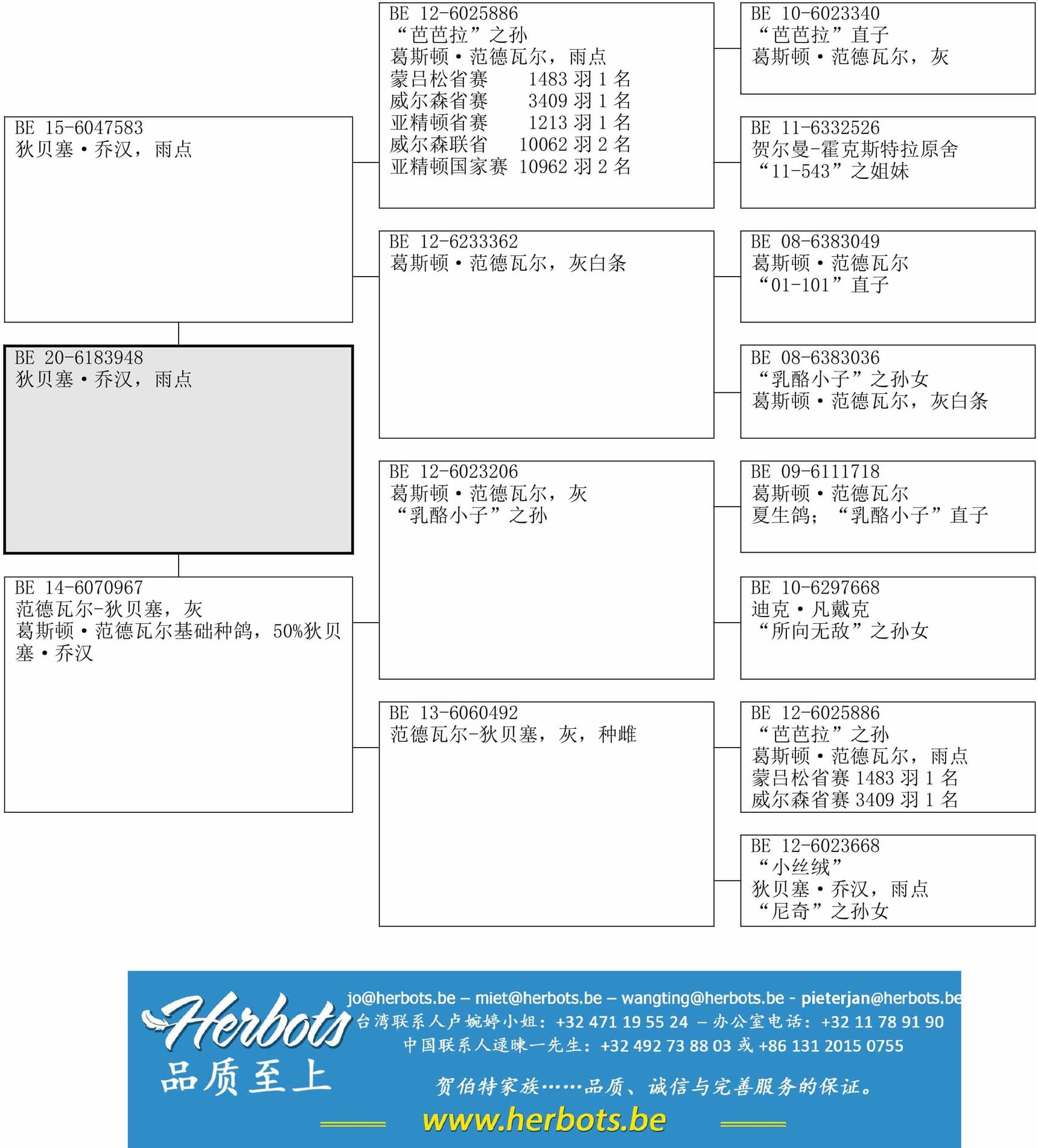 100%葛斯顿·范德瓦尔“芭芭拉”回血(葛斯顿·范德瓦尔原舍)“芭芭拉”荣获:威尔森省赛3409羽1名威尔森联省11062羽2名蒙吕松省赛1483羽1名亚精顿省赛1213羽1名亚精顿国家赛区3740羽1名亚精顿国家赛11001羽3名世界名鸽“乳酪小子”回血(葛斯顿·范德瓦尔原舍)