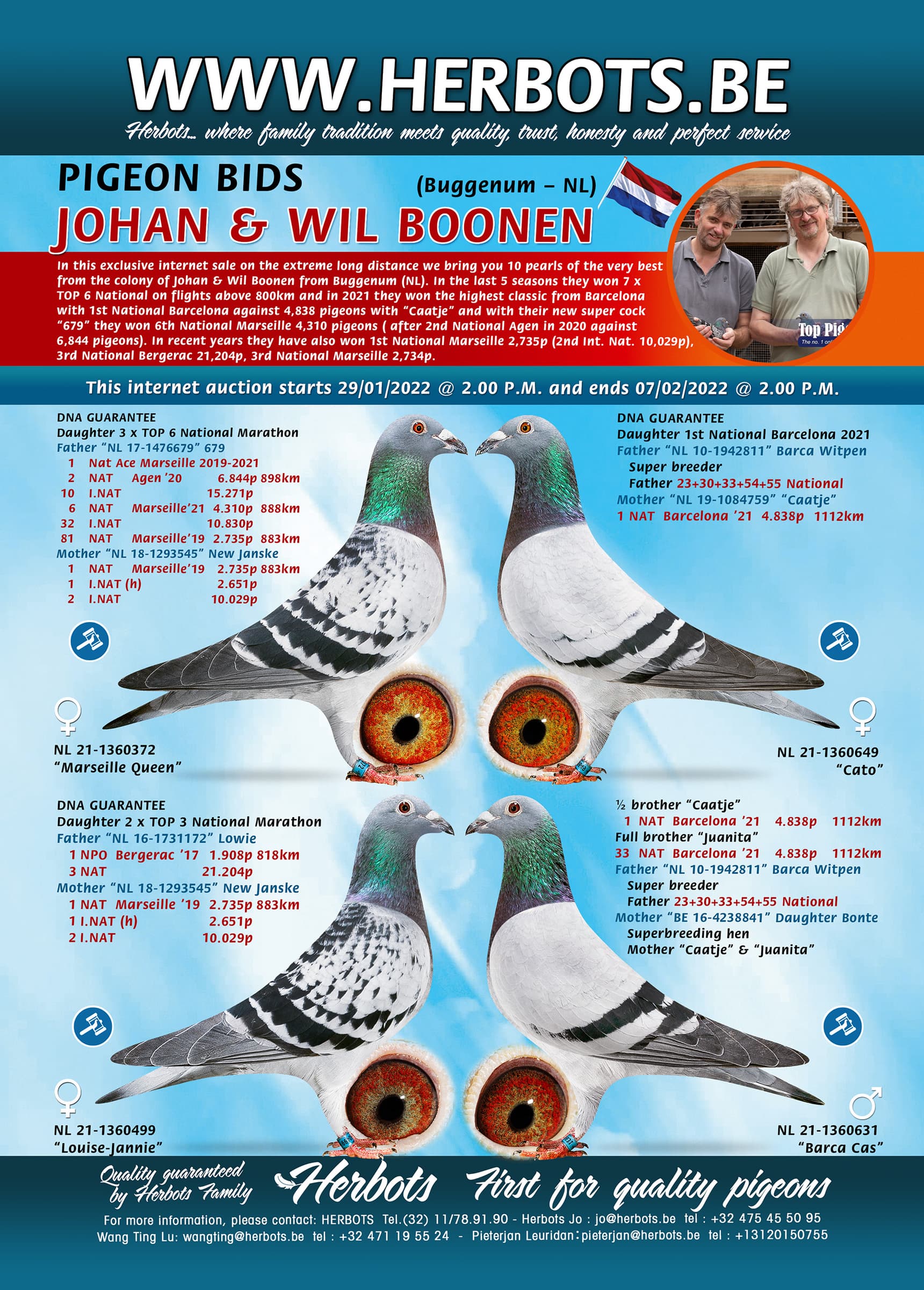 在本次超长距离独家网络拍卖会中,我们带来了来自比赫讷姆-荷兰的约翰&威尔·波恩鸽舍最佳鸽。在过去五个赛季,他们荣获:800公里国家赛7次前6名,在2021年以“小卡特”荣获巴塞罗那最高经典赛绩:巴塞罗那国家赛4838羽1名;以及他们的新超级雄鸽“679号”荣获:马赛国家赛4310羽6名(20年阿让国家赛6844羽2名);近年来,他们还荣获:马赛国家赛2735羽1名(国际赛10029羽2名)-贝吉拉克国家赛21204羽3名-马赛国家赛2734羽3名。