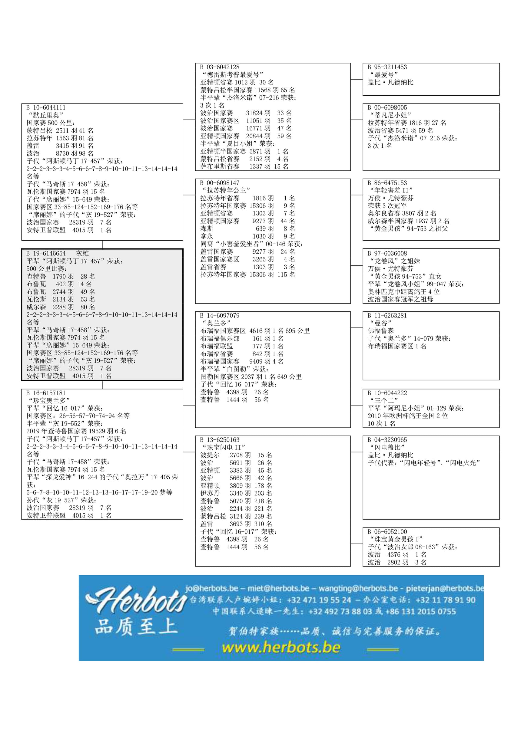 全平辈 “阿斯顿马丁” 荣获: 500公里16次高位入赏 全平辈 “马奇斯”荣获: 瓦伦斯国家赛 7,974羽15名全平辈“席丽娜”荣获: 国家赛区33名和85名;“席丽娜”的子代荣获: 波治国家赛 28,319羽7名