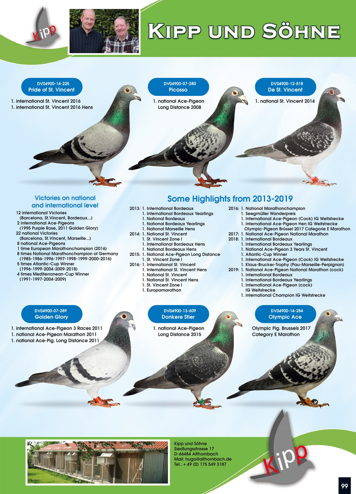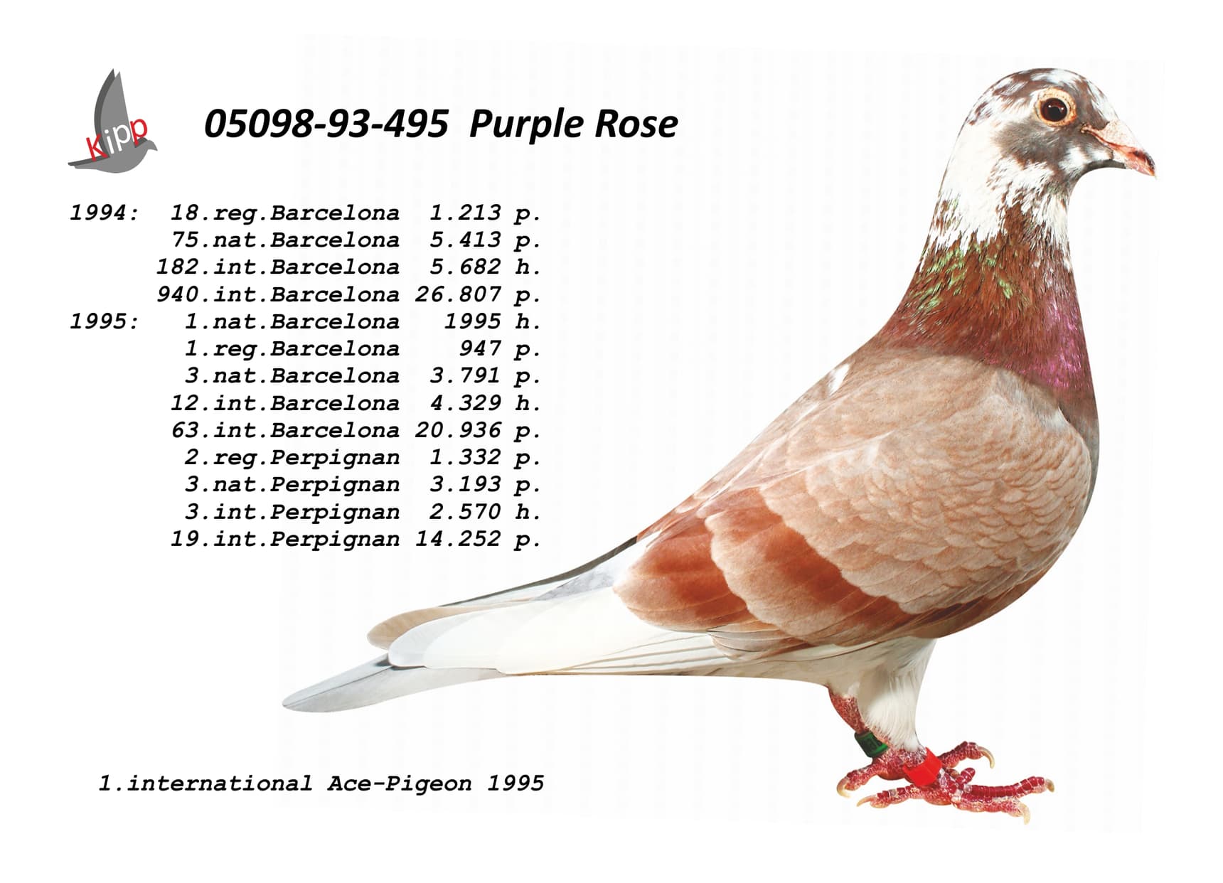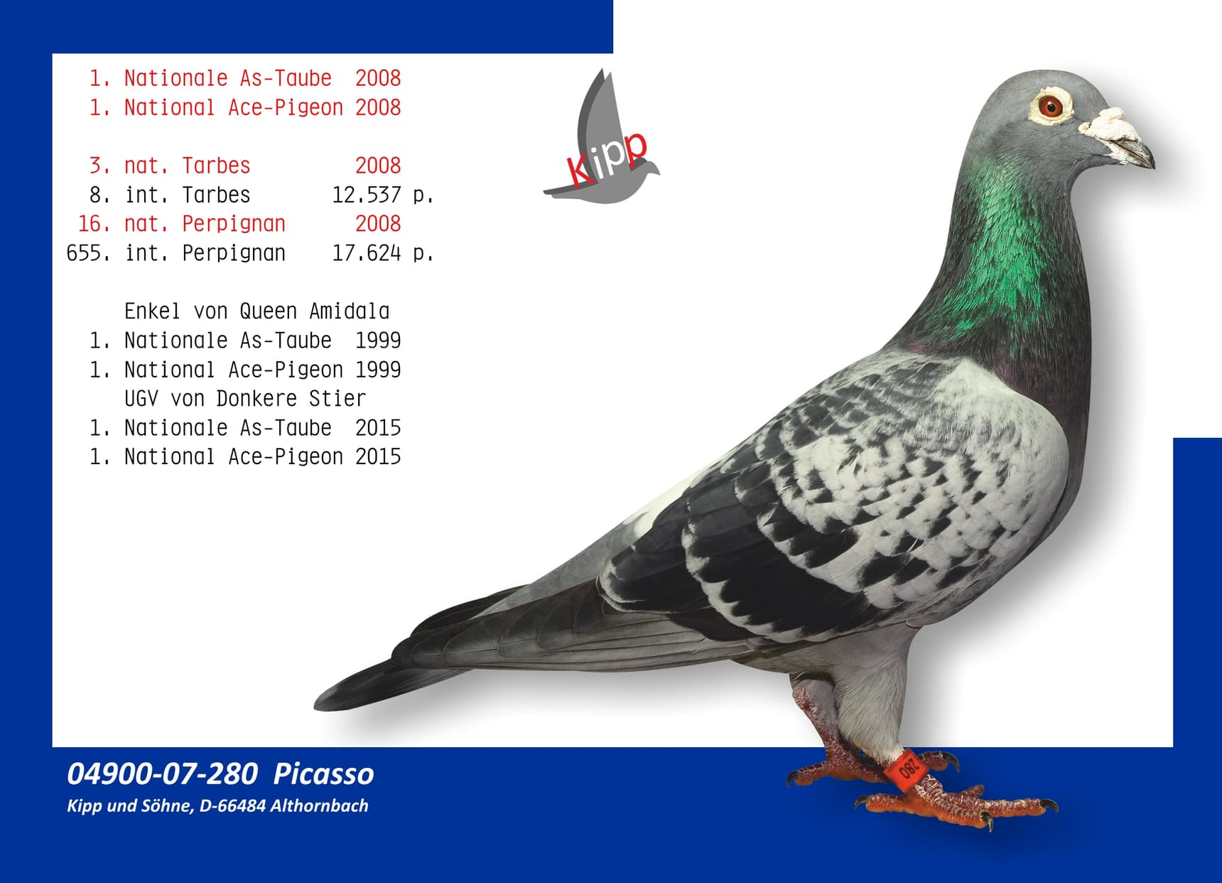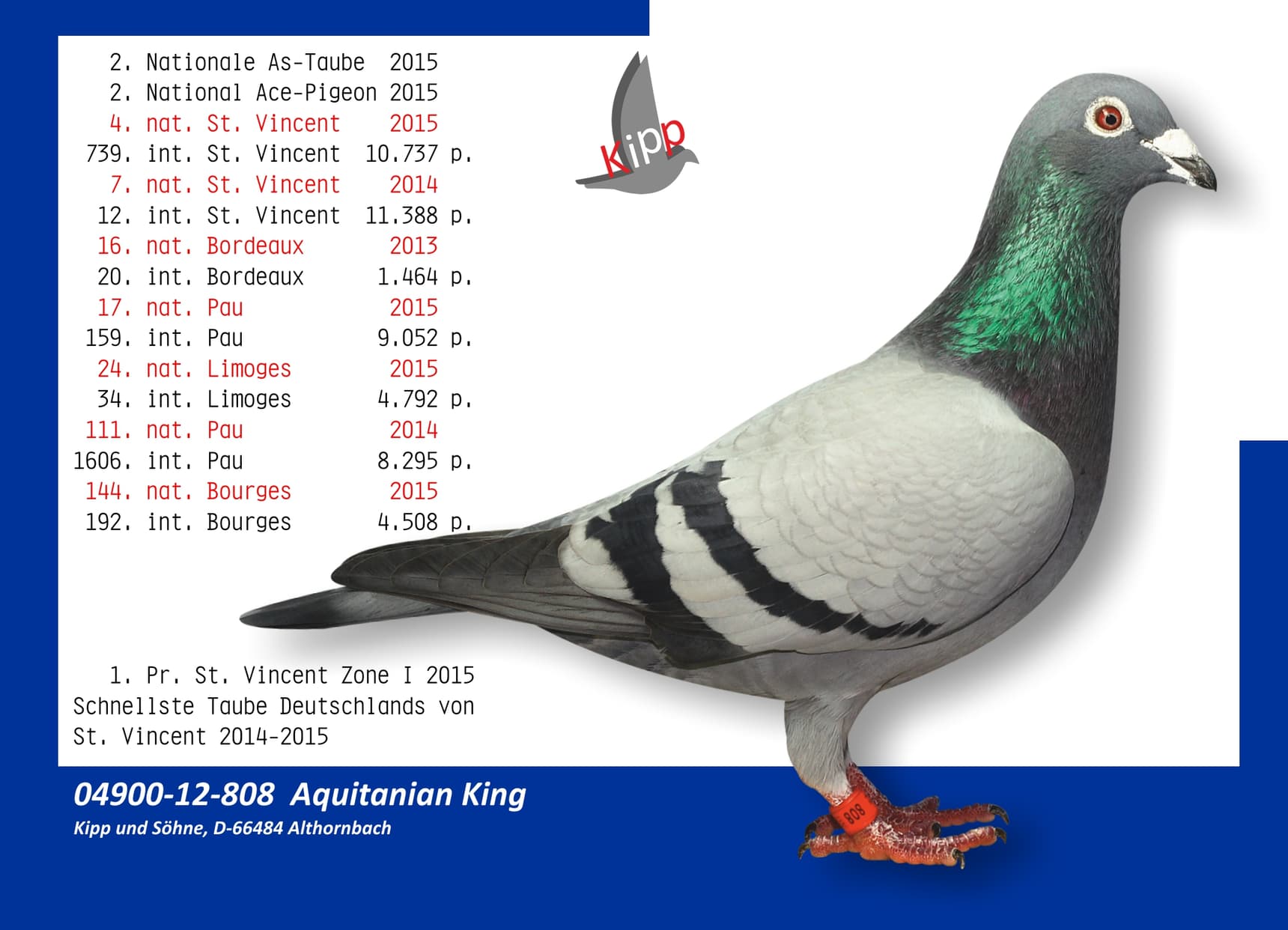 其父“阿基坦国王”荣获:2015年国际赛鸽王全国2位 - 圣文森国际赛 11,388羽12名 – 利蒙治国际赛 4,792羽34名半平辈荣获: 奥克瑟尔 1,586羽13名 - 波治国际赛 3,058羽20名 – 波治国际赛 1,918羽54名 - 利蒙治国际赛 2,365羽62名